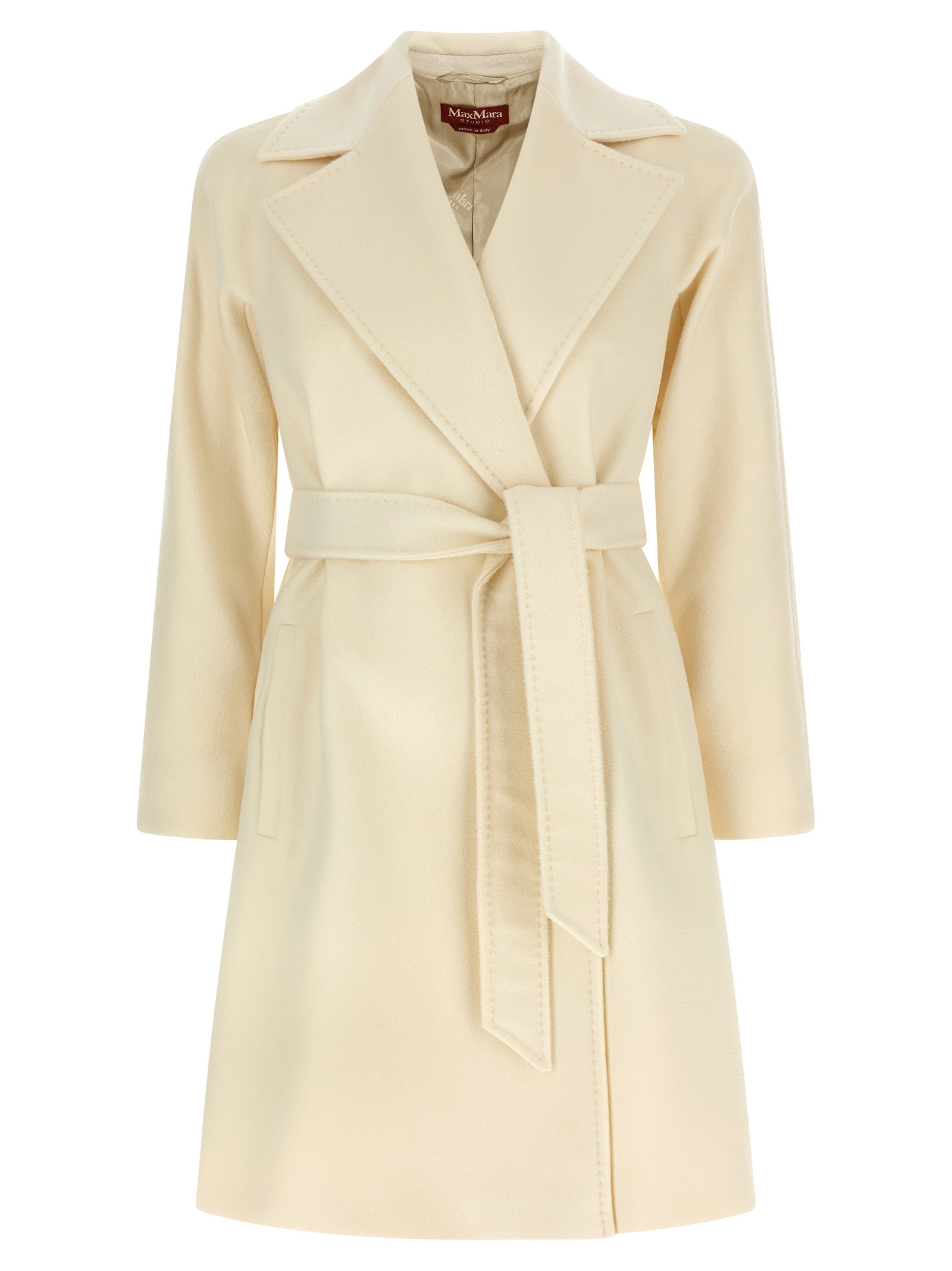 'Dravenna' pure wool drap coat finished with tailored dot, robe style, flared silhouette, lapel collar, pockets, long kimono sleeves, monogram viscose lining, removable belt.