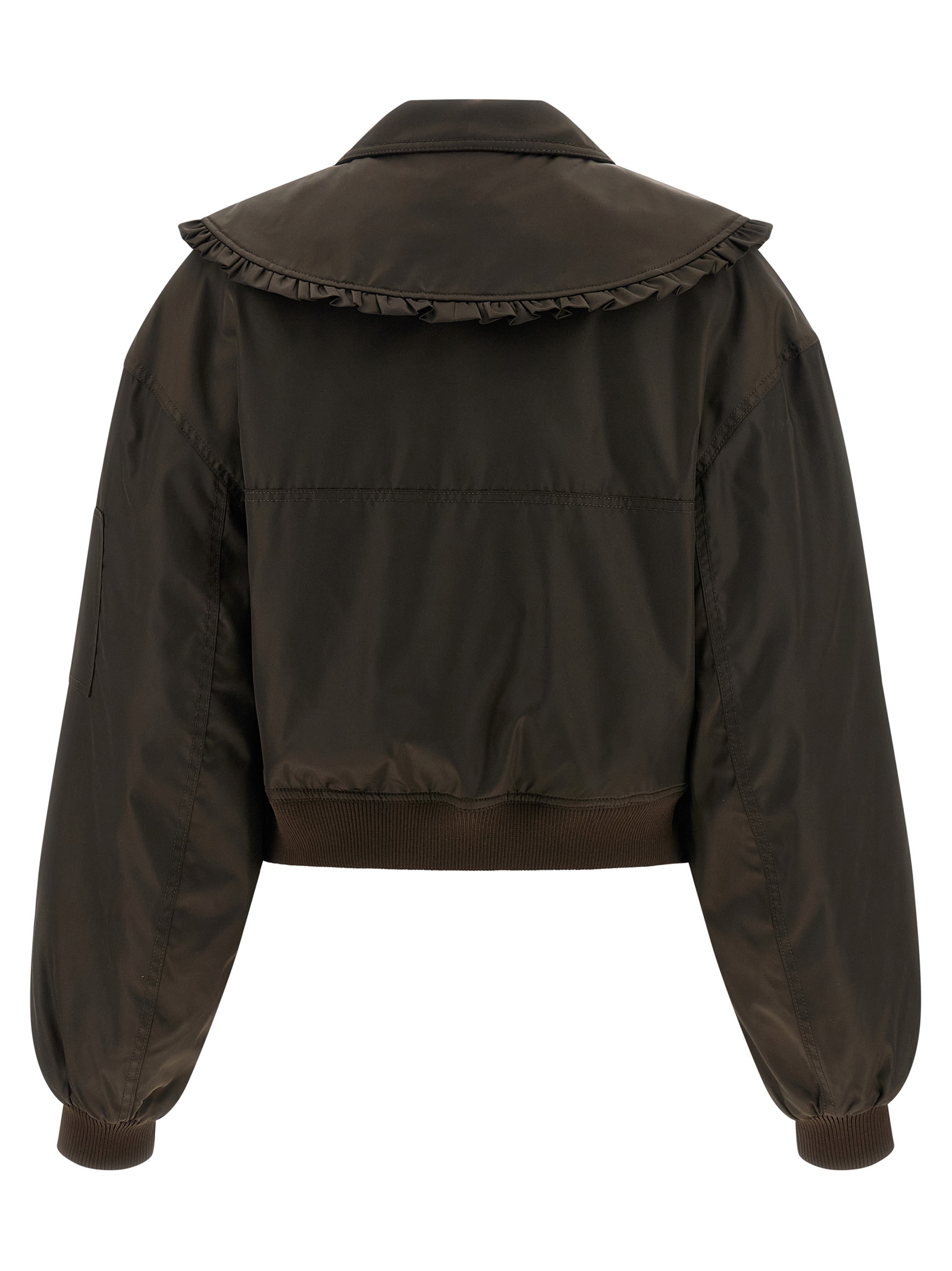 Дюкесна 'Duchesse Nylon' нейлонова бомбер куртка з тонкими еластичними в'язаними деталями, трохи укорочений лацкан з знімними рюшами, комір сорочки, застібка на блискавці спереду, кишені, довгі широкі рукава з манжетами та опущеними плечима, банд на подолі, підкладка з суміші віскози з монограмою. СТІЙКИЙ: продукт виготовлений з переробленого поліаміду.