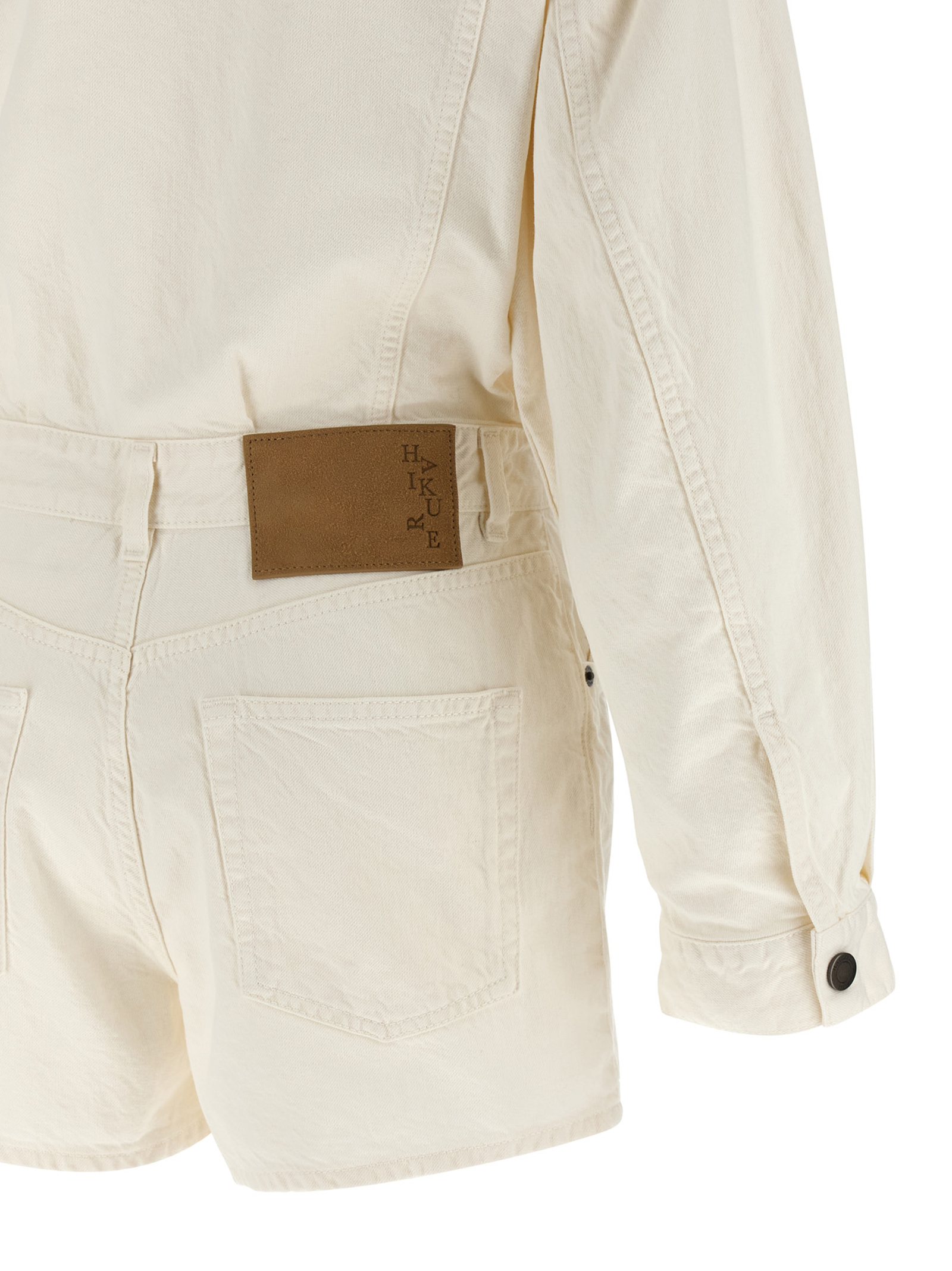 'Elle Authentic Lax' комбінезон з короткими штанинами з бавовняного деніму з поясом на талії з петлями, коміром сорочки та застібкою спереду з металевими гудзиками, кишенями, довгими рукавами з манжетами.