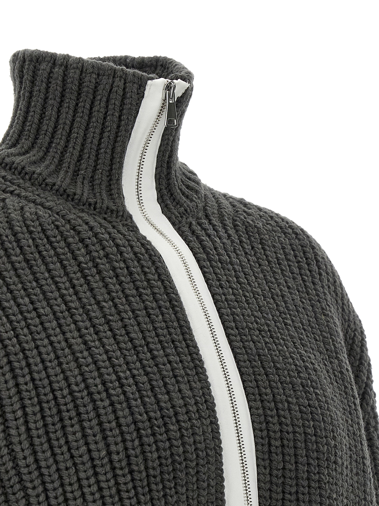 'Evan' кардиган з важкої в'язанної virgin wool, високий комір з знімним контрастним вставкою, передня застібка на блискавці, кишені, довгі рукави з манжетами.