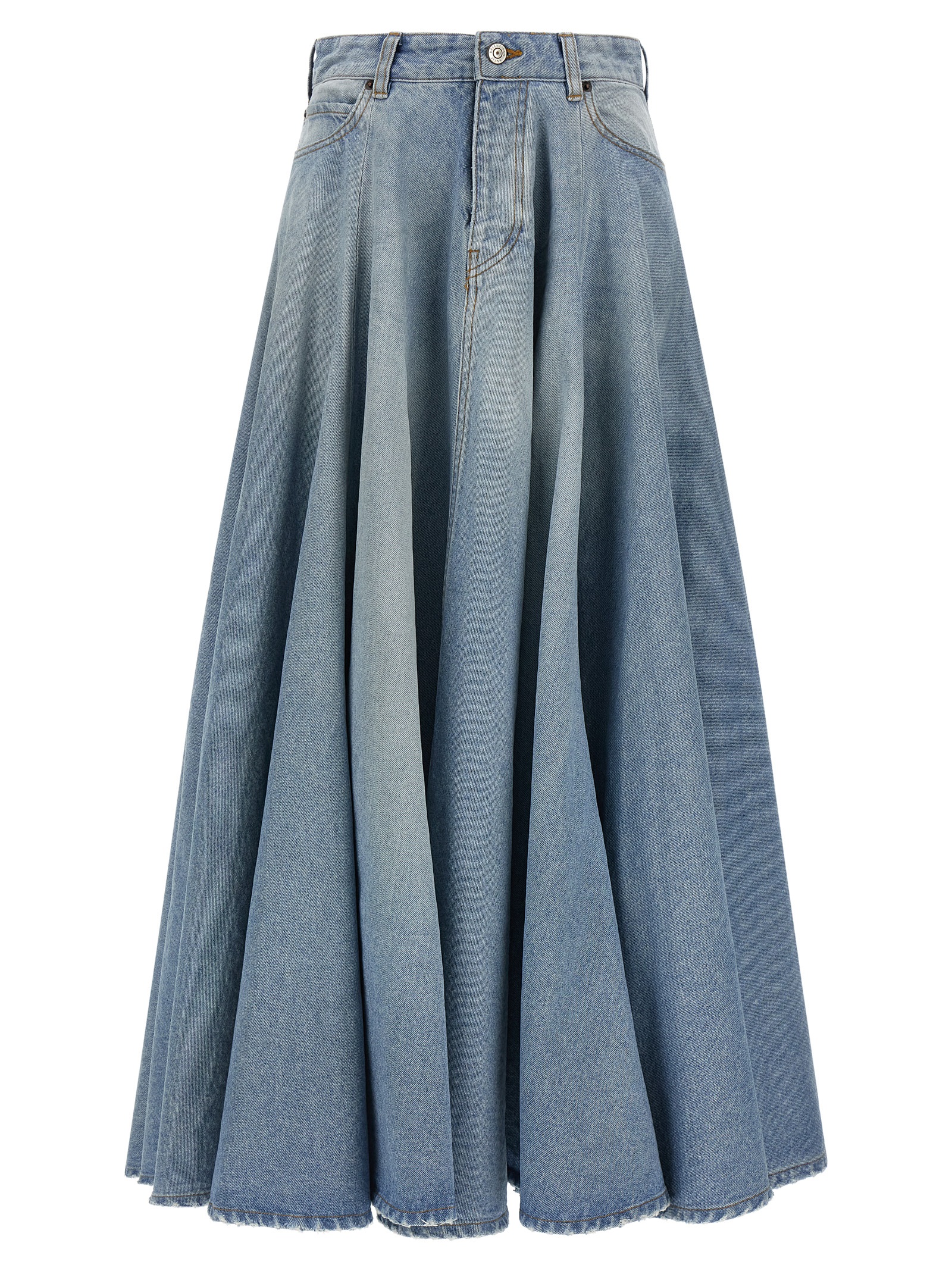 Міді спідниця з зношеного та зношеного бавовняного деніму з кроєм 'Godet', контрастні шви, застібка на блискавці та кнопці спереду, кишені, середня талія, задня етикетка з логотипом.