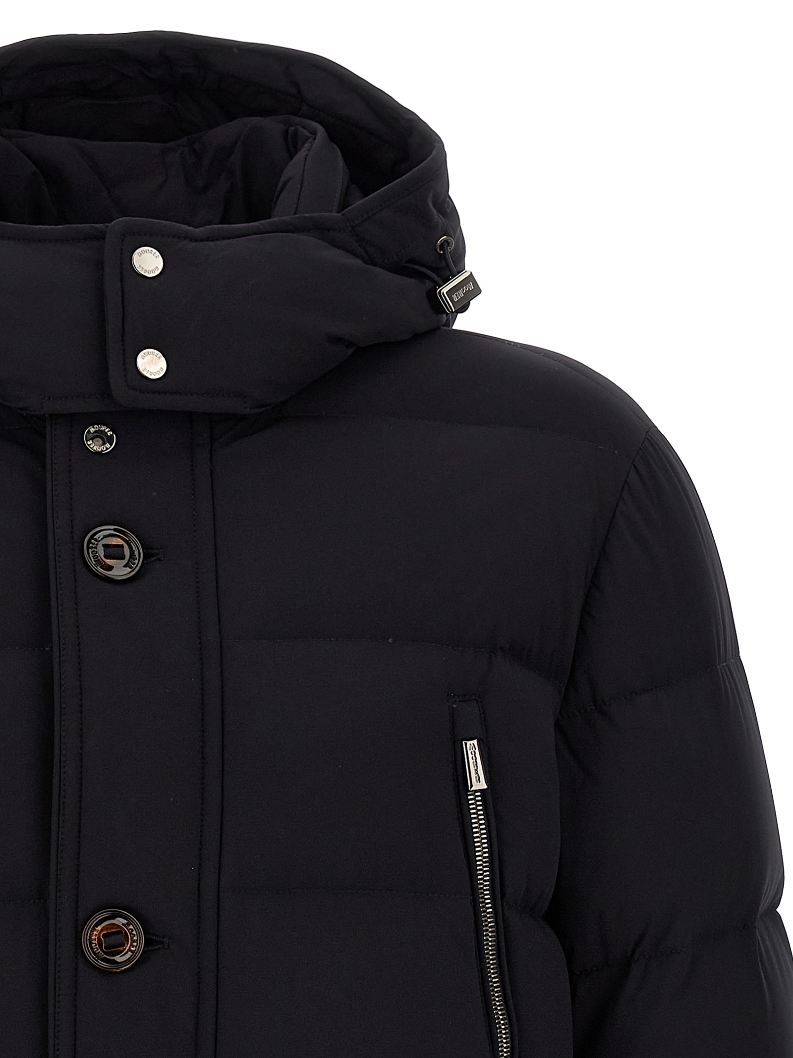 Довгий 'Gorner' пуховик з квіткової водонепроникної еластичної тканини з наповнювачем з гусячого пір'я, знімний капюшон на шнурівці та кнопці на шиї, високий комір, застібка на блискавці та кнопці спереду, кишені, довгі рукави з в'язаними вітрозахисними манжетами. Колір: дуже темно-синій