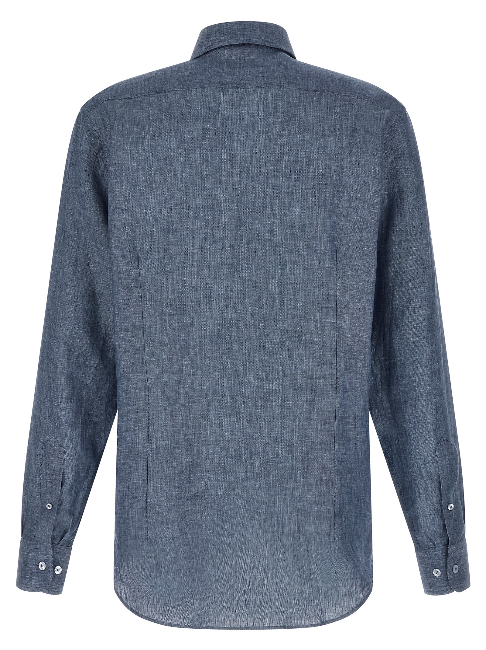 Меланжева льняна сорочка з вишитим логотипом 'Pegaso' в тон, застібка на кнопках спереду, довгі рукави з манжетами.