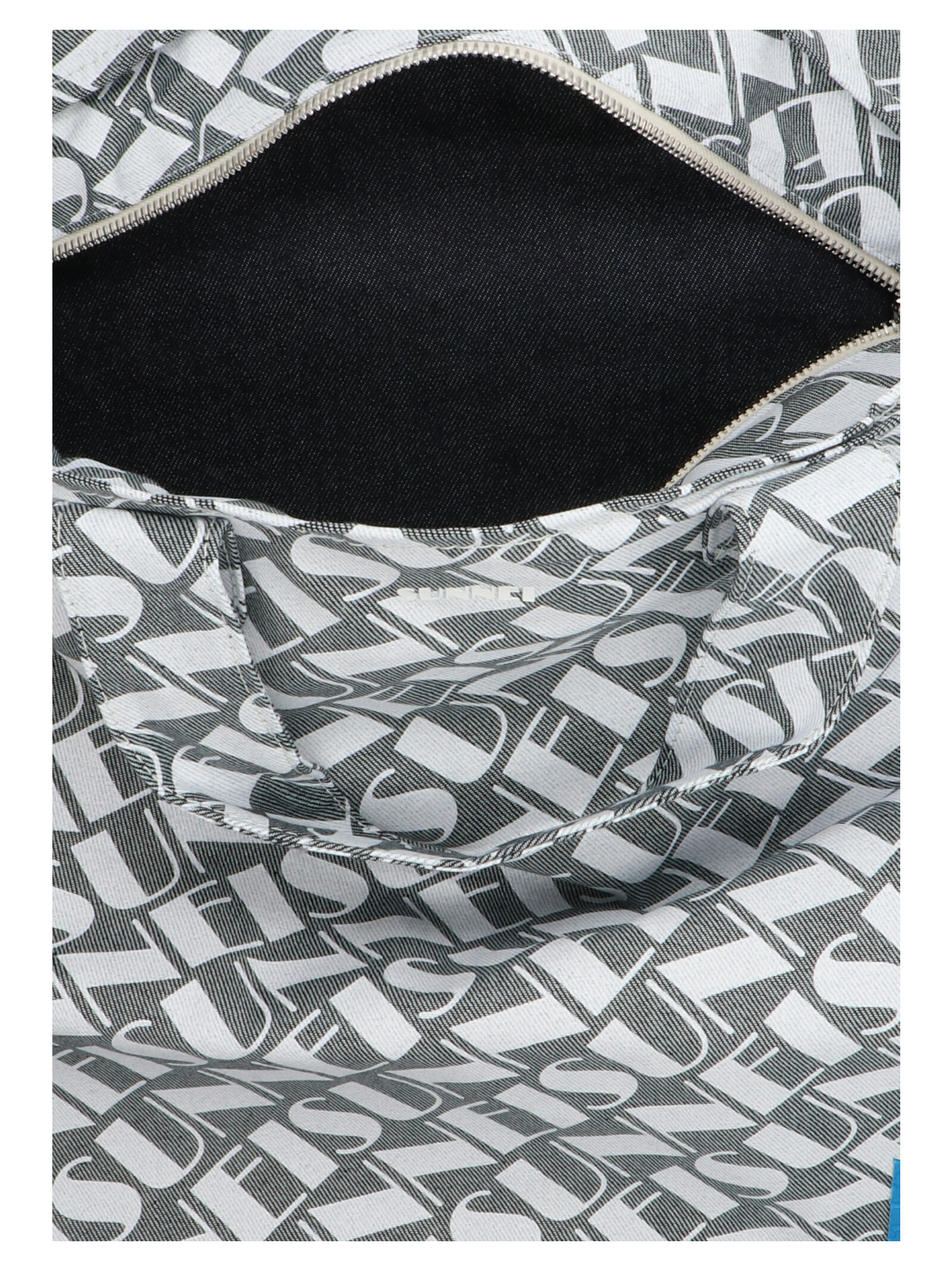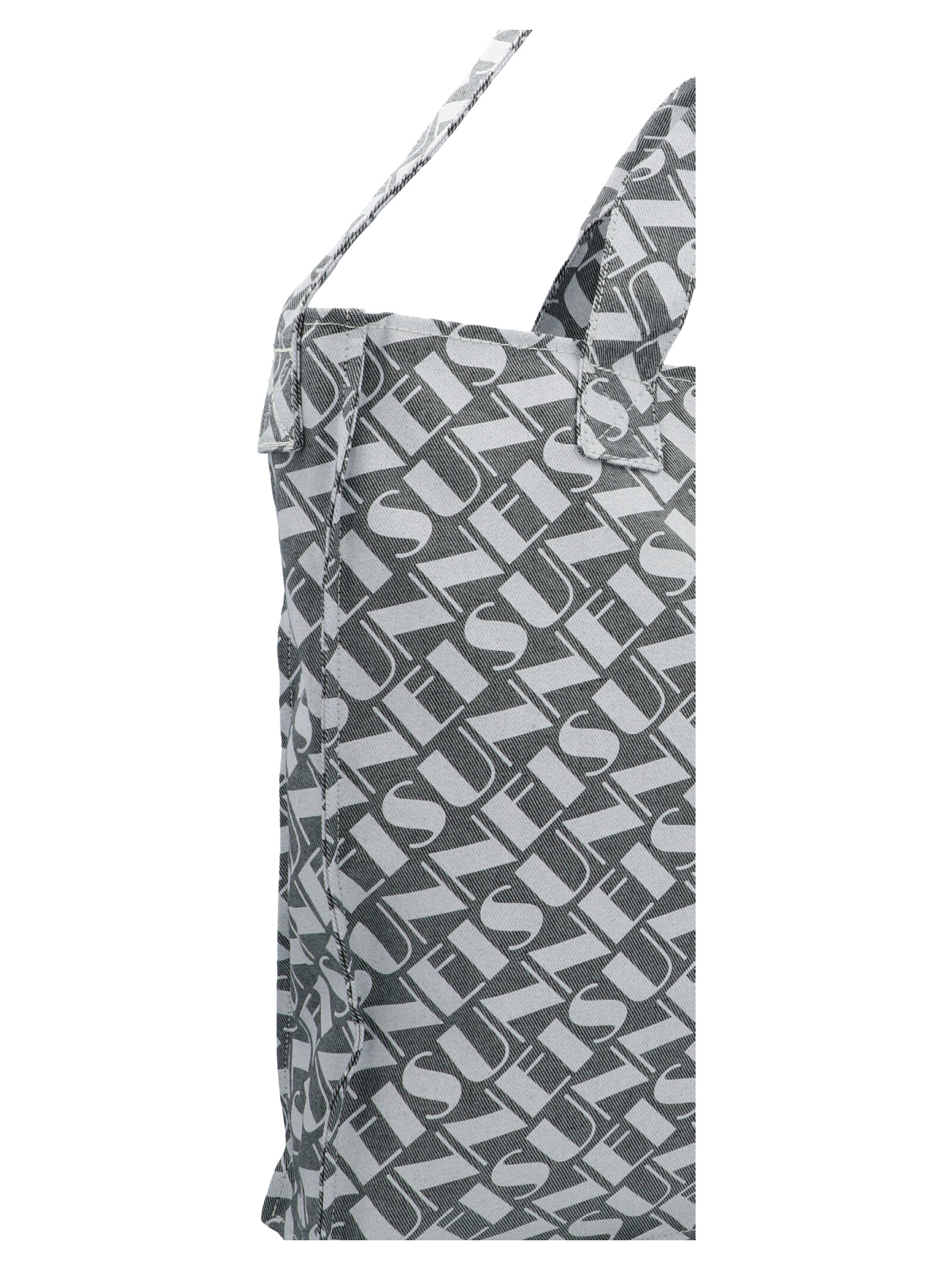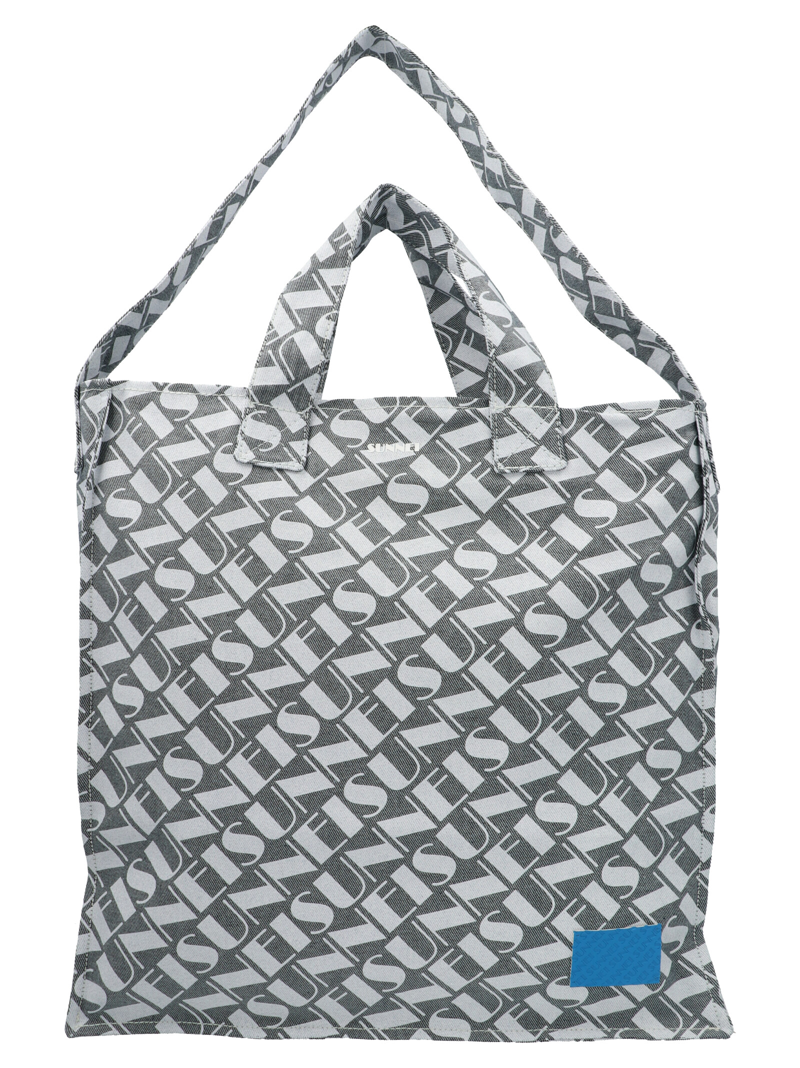 Denim shopping bag featuring a logo print, a zip, silver hardware and a double handle.