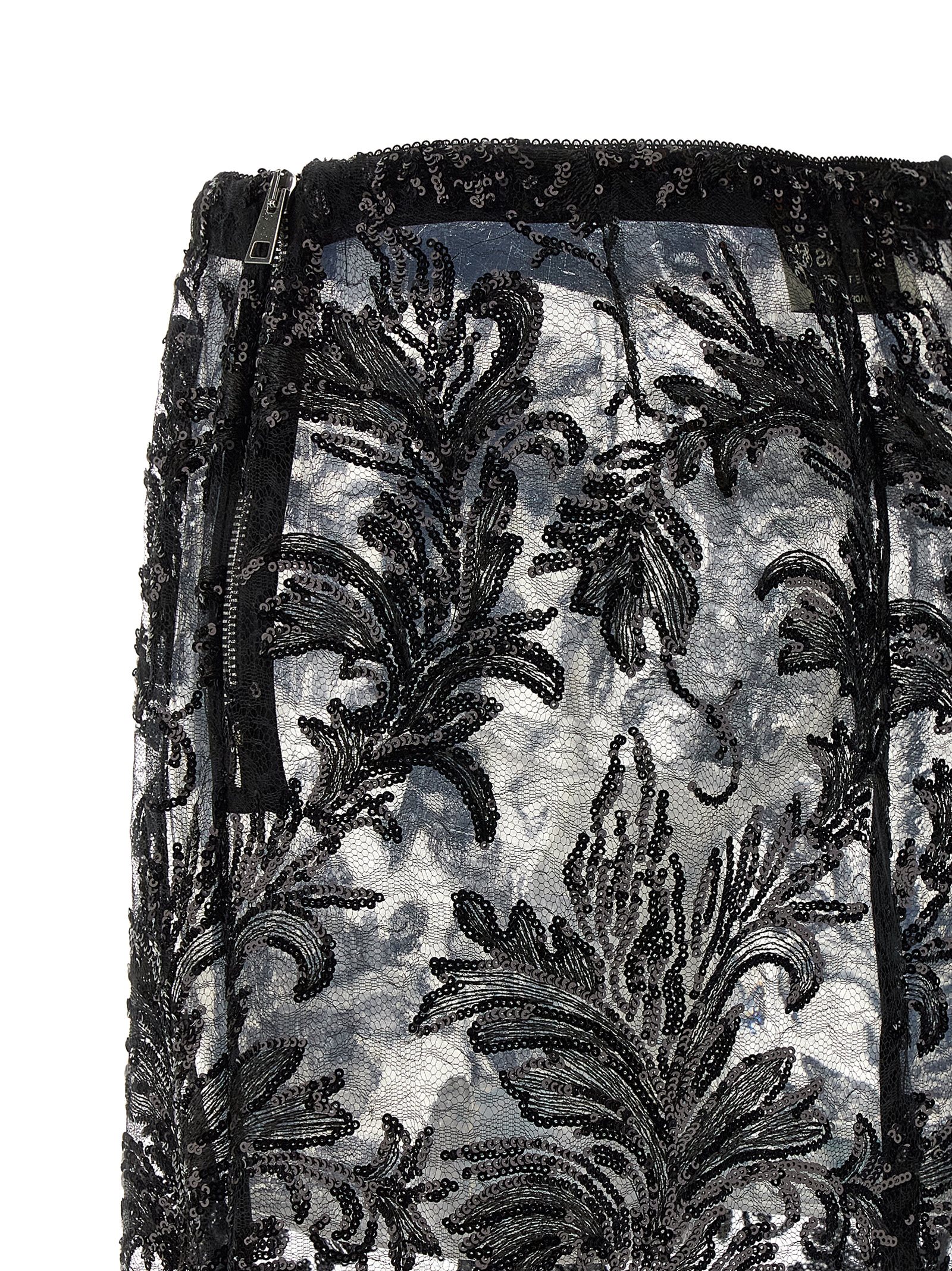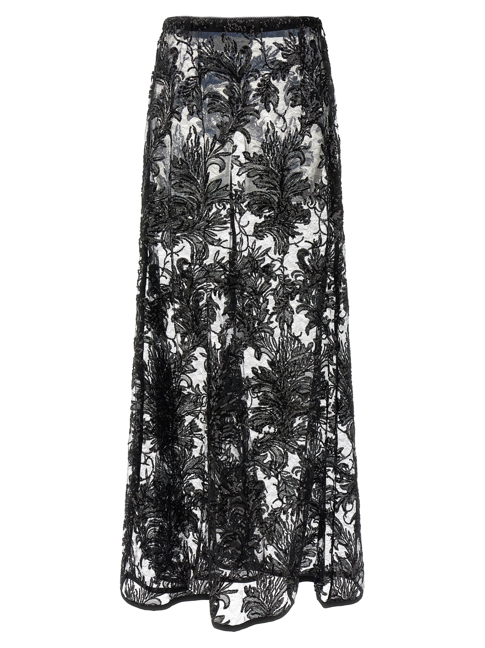 Максі-спідниця 'Maria Cristina' з мережива з вишивкою з паєток, напівпрозора, розкльошена внизу, застібка на блискавці та гачку з боку.