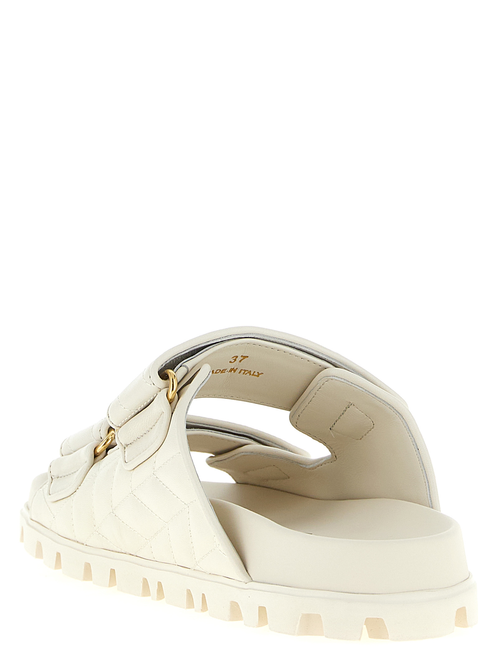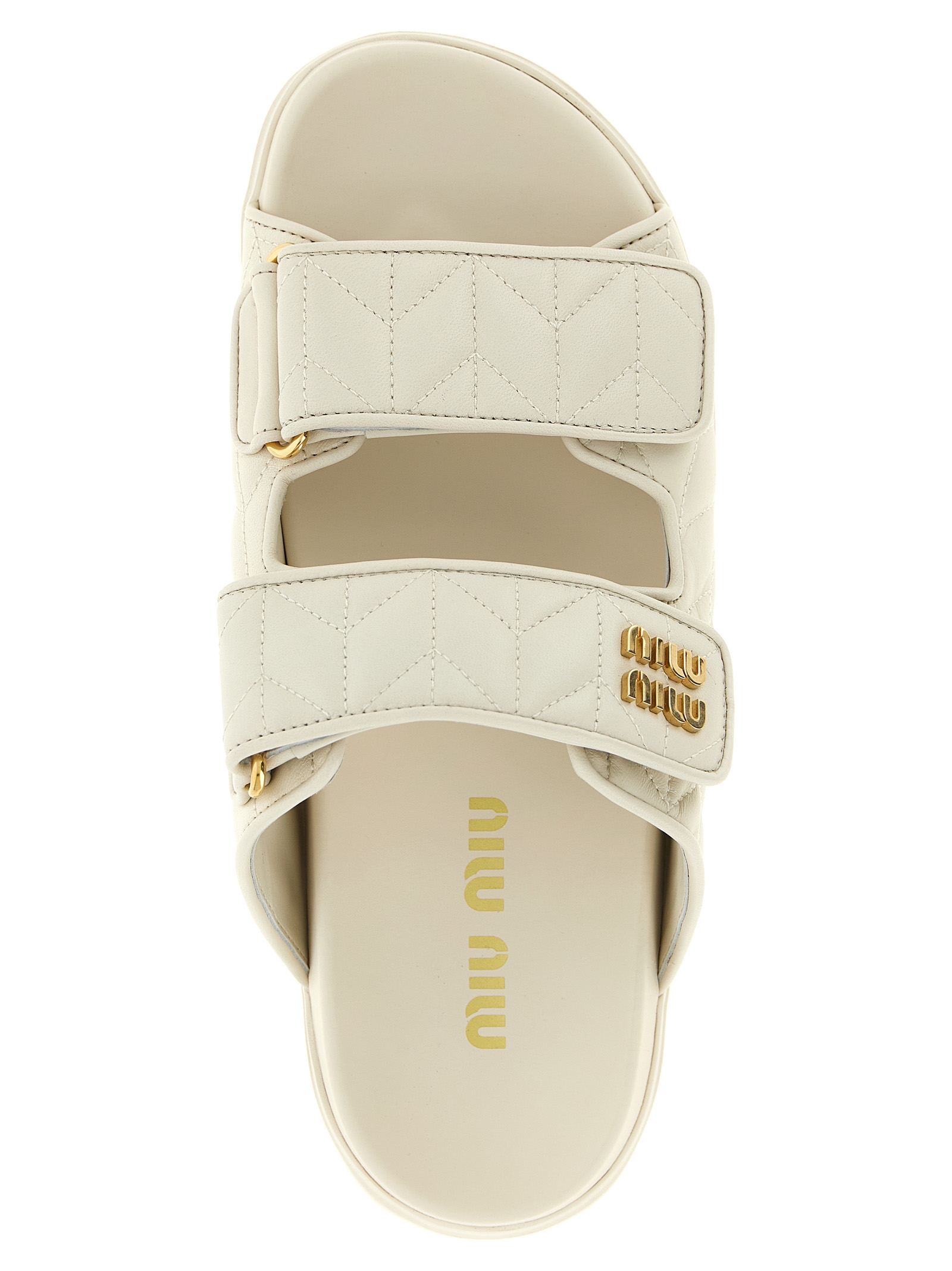 Сандалі з мателасе з регульованими липучками з металевою аплікацією з логотипом, та гумовою підошвою.