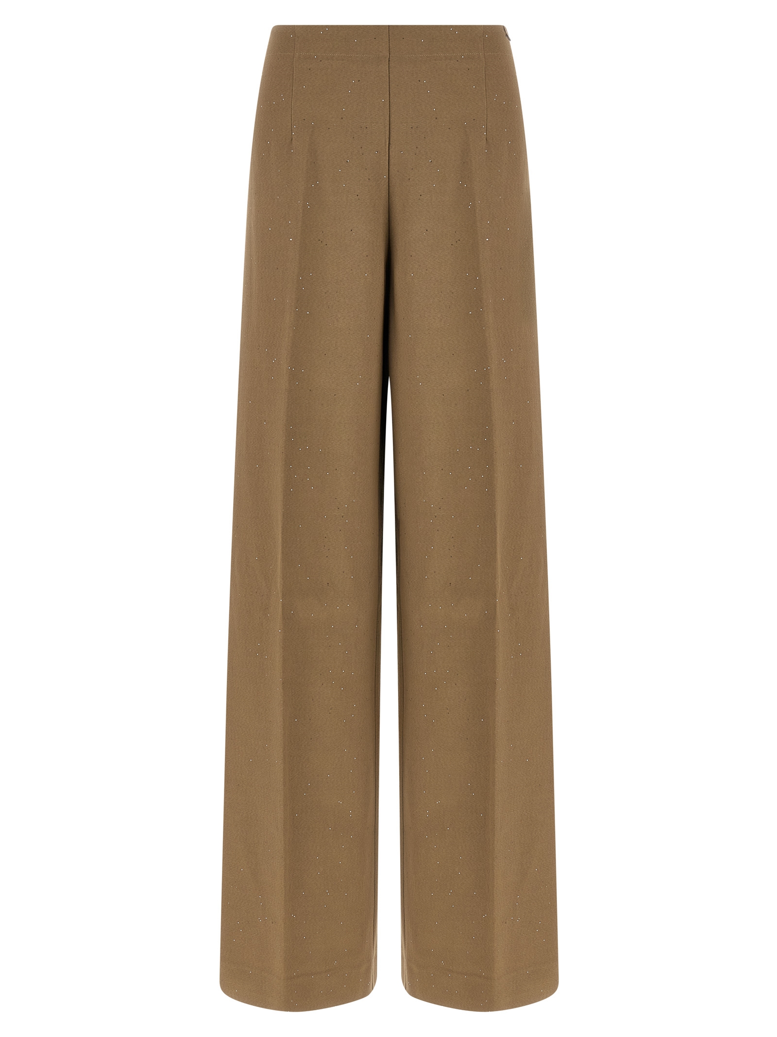 Штани з суміші віскози та льону з тонко-тонким мікропаєтковим аплікацією, широкий і прямий крій, еластичний пояс ззаду, бічна застібка на блискавці.