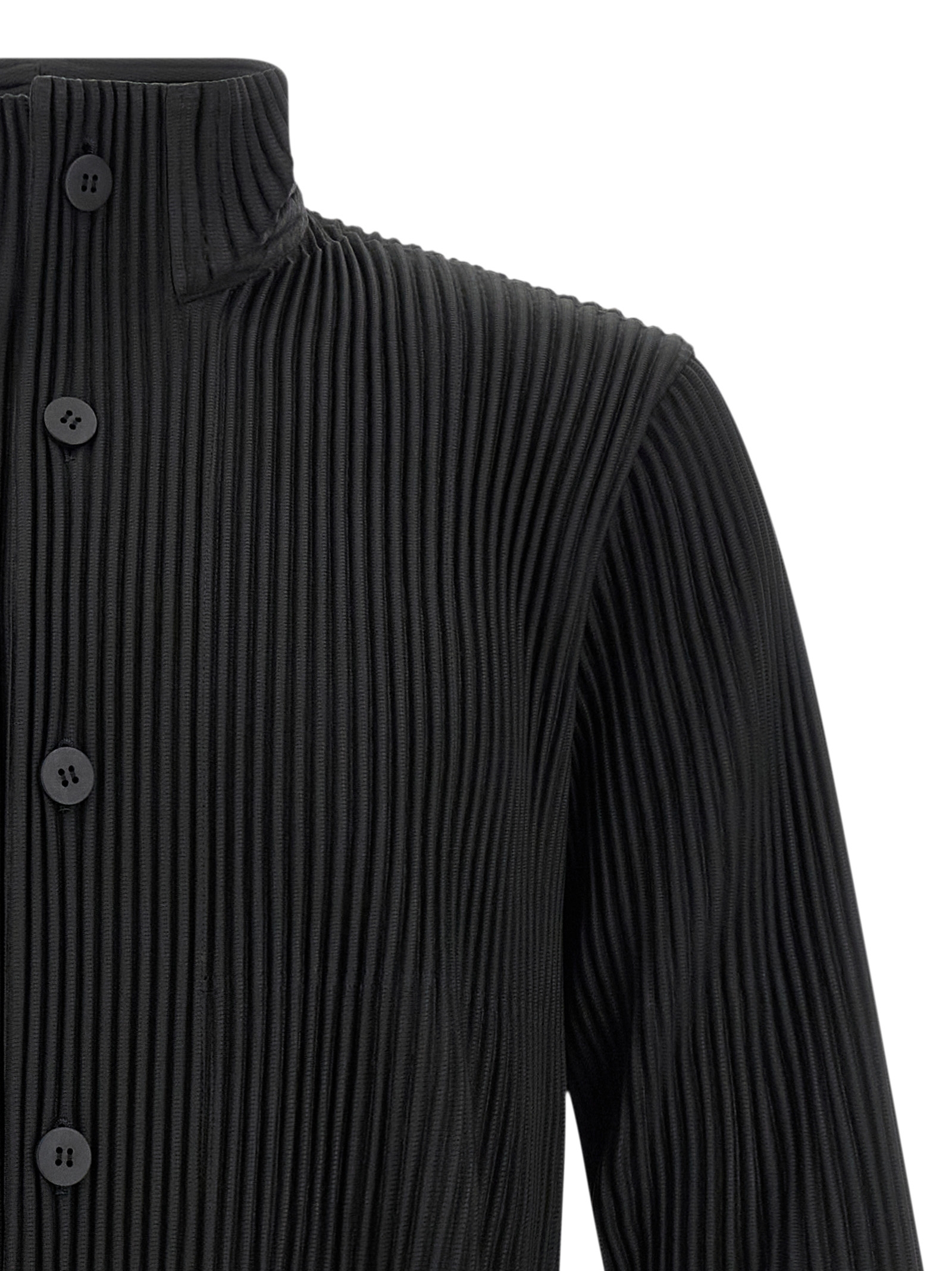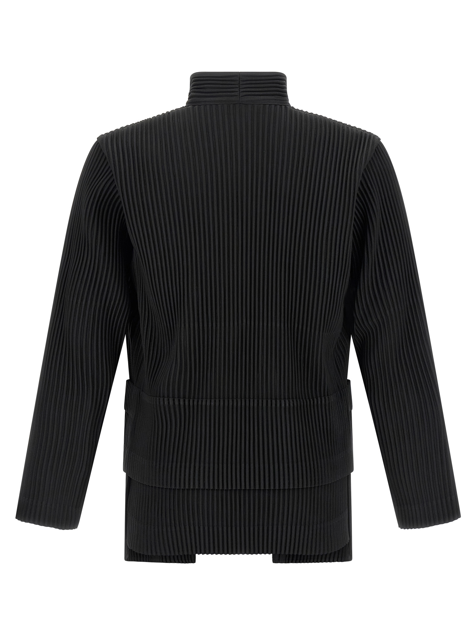 Куртка з багатьма кишенями з складками з стоячим коміром, передня застібка на гудзиках, кишені, довгі рукави та асиметричний поділ.