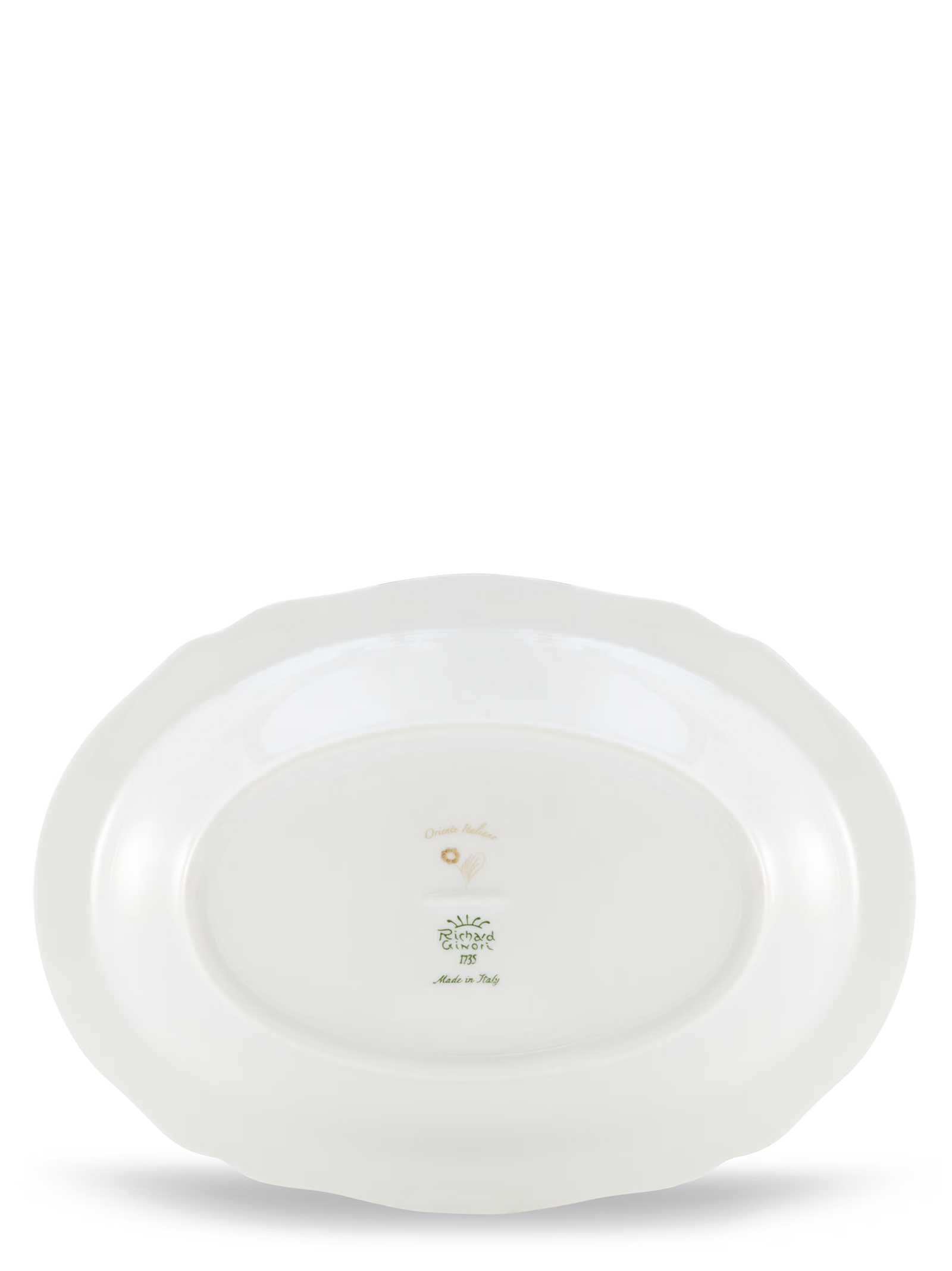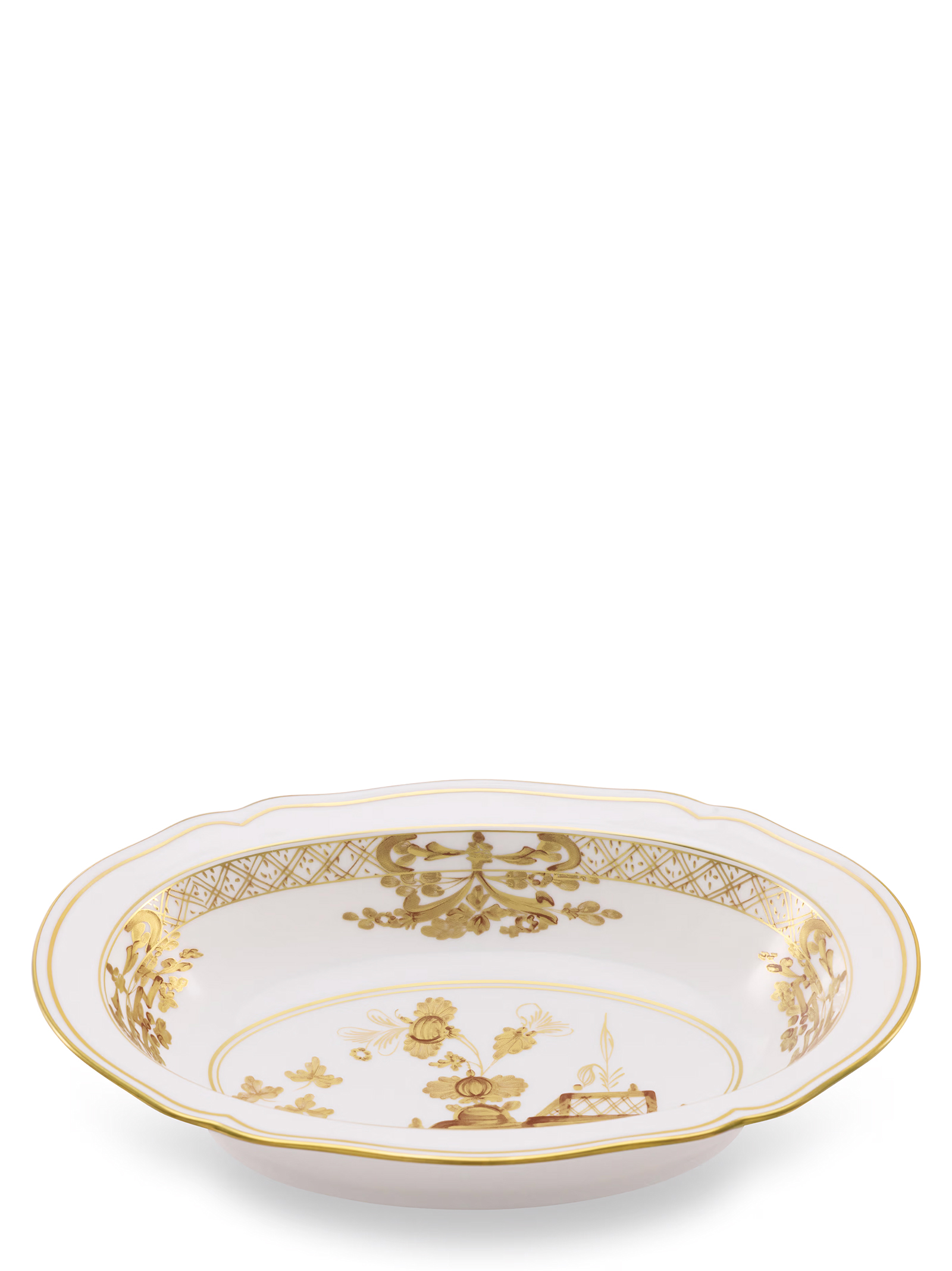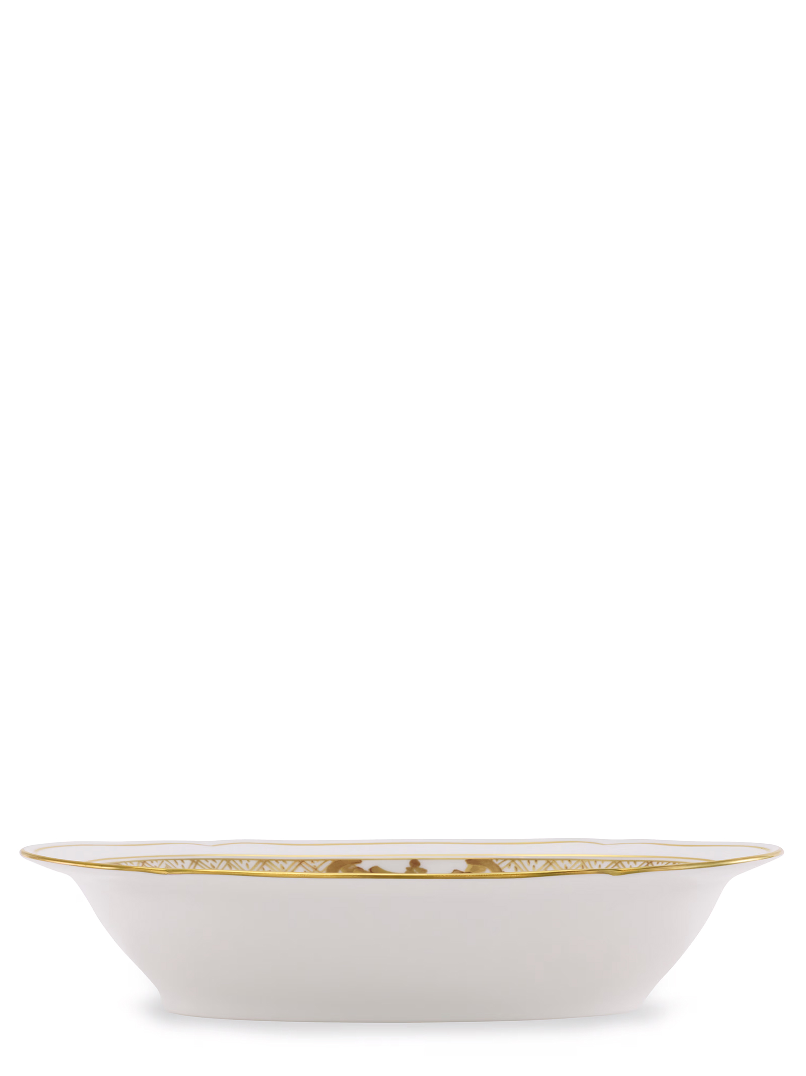 Овальна чаша з декором білого кольору Aurum і золотим обрамленням. Колекція ‘Oriente Italiano’, форма ‘Antico Doccia’ з іконічним мотивом “гвоздики”. Не підходить для використання в мікрохвильовій печі. Безпечна для миття в посудомийній машині на делікатному циклі.