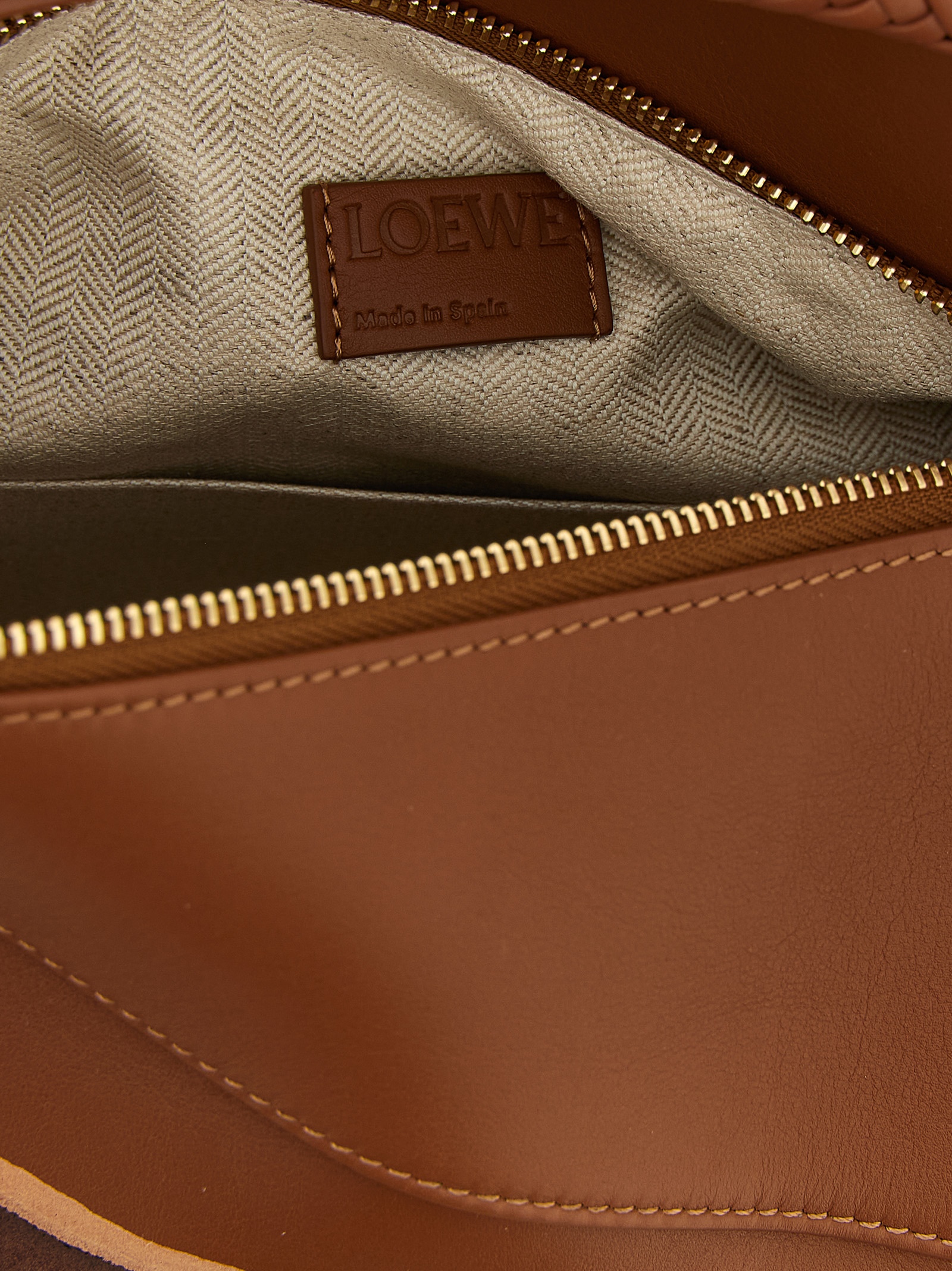 Маленька сумка 'Puzzle Edge' з телячої наппа та замші, класична конструкція з перекритими панелями з одноточковим швом, фіксована плетена ручка, застібка на клапані з тисненим логотипом та прихованою блискавкою під ним, задня кишеня на блискавці, регульований та знімний плечовий ремінь.