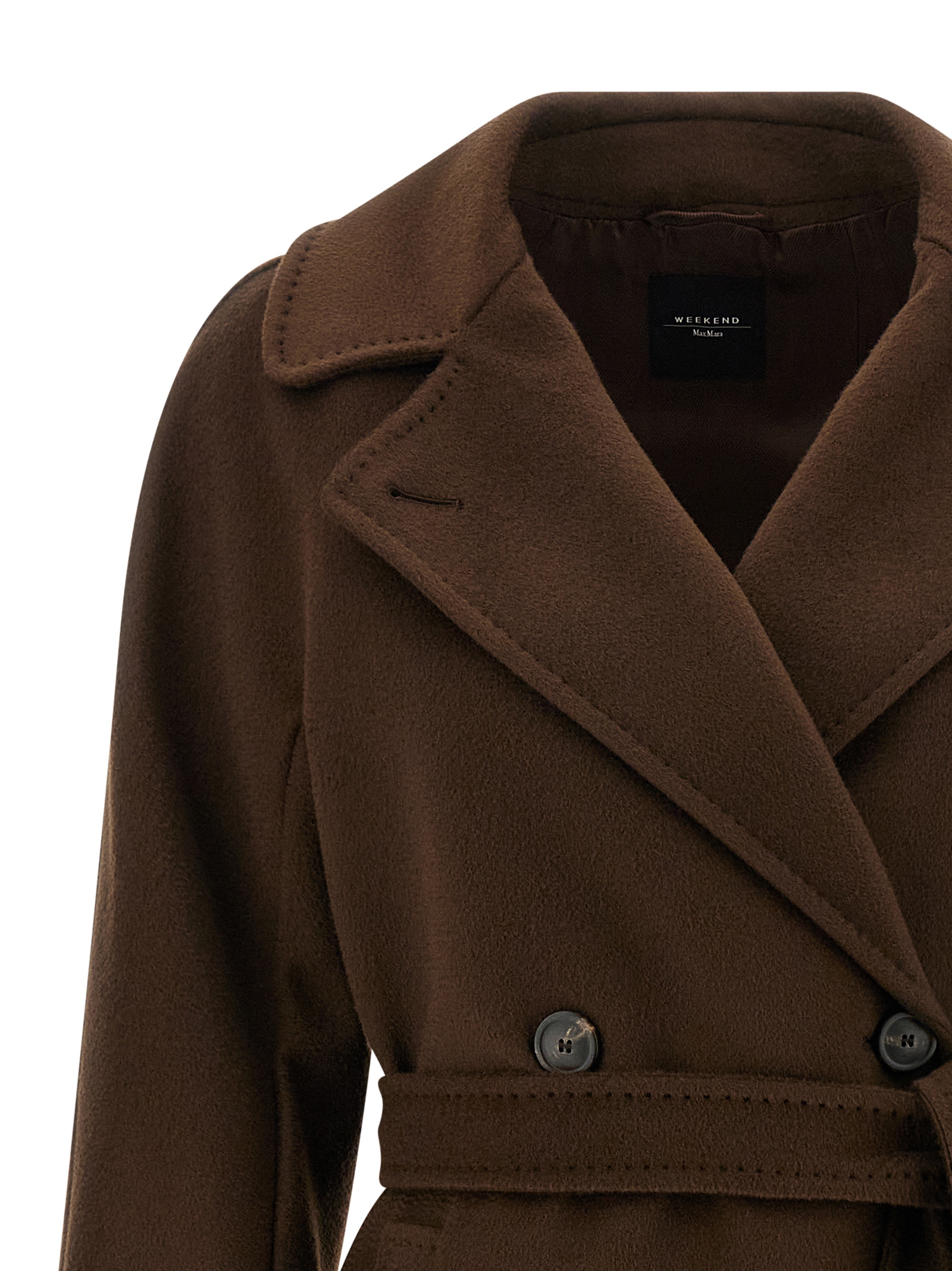 'Resina' двобортне пальто з V-подібним вирізом з вовни з широкими лацканами, застібка на гудзиках, бокові кишені, центральний розріз ззаду, зав'язка на талії, довгі та широкі рукави.