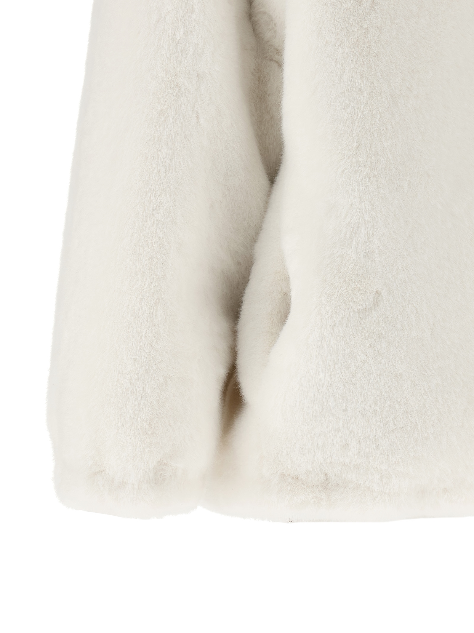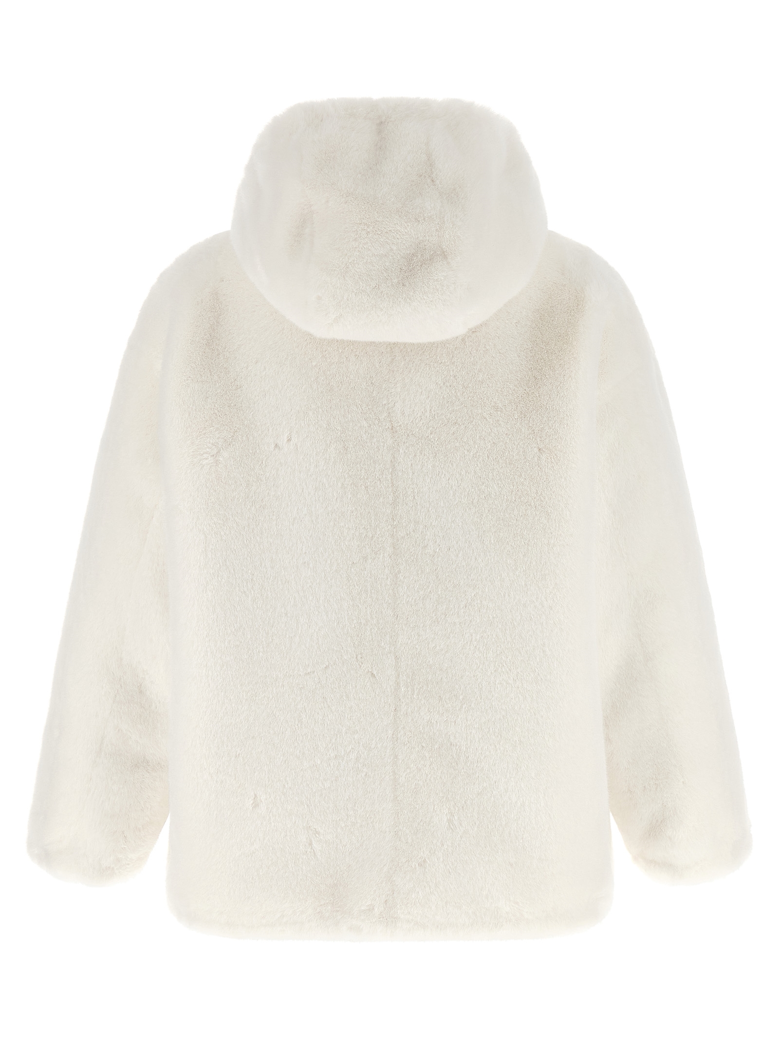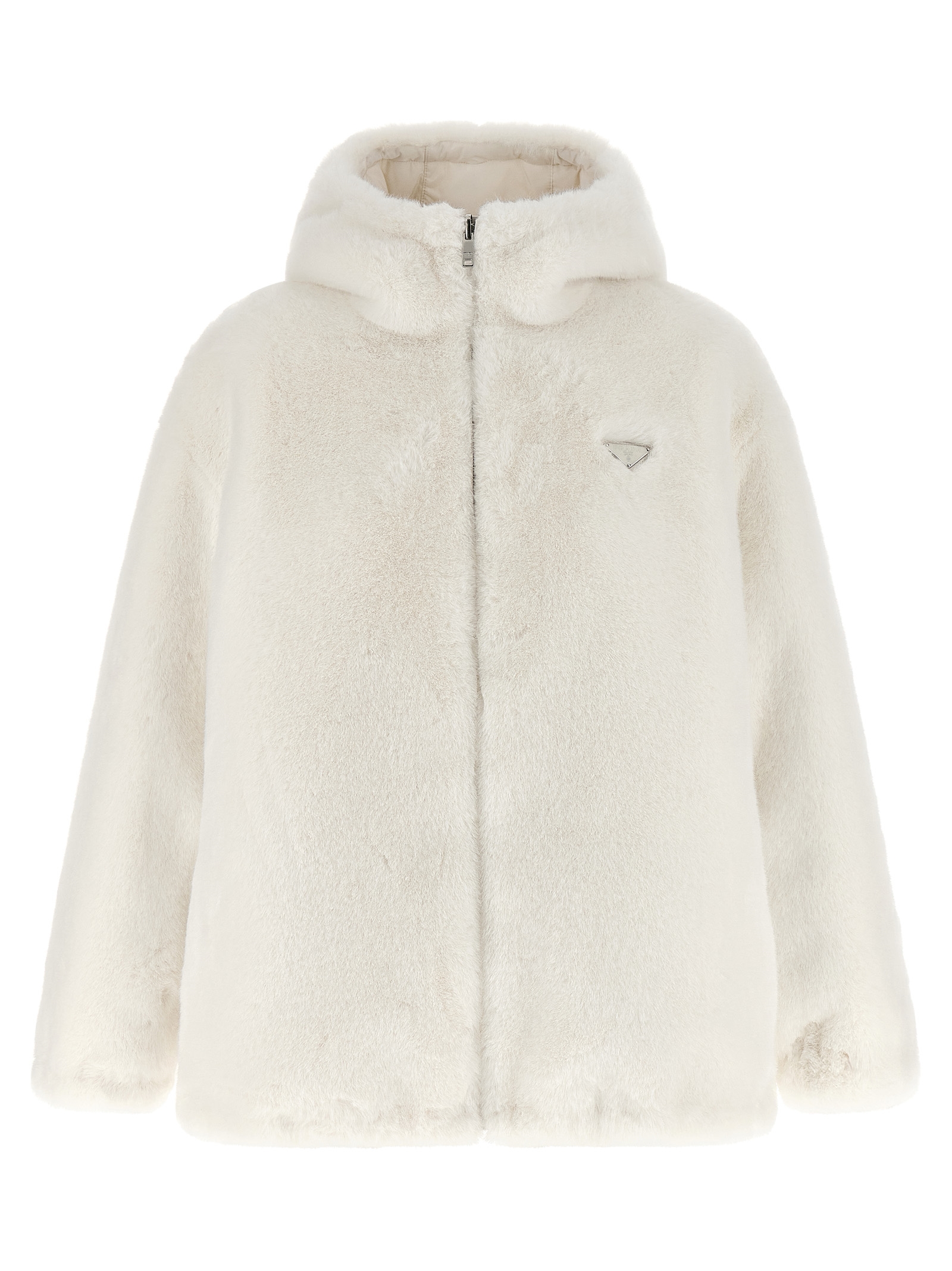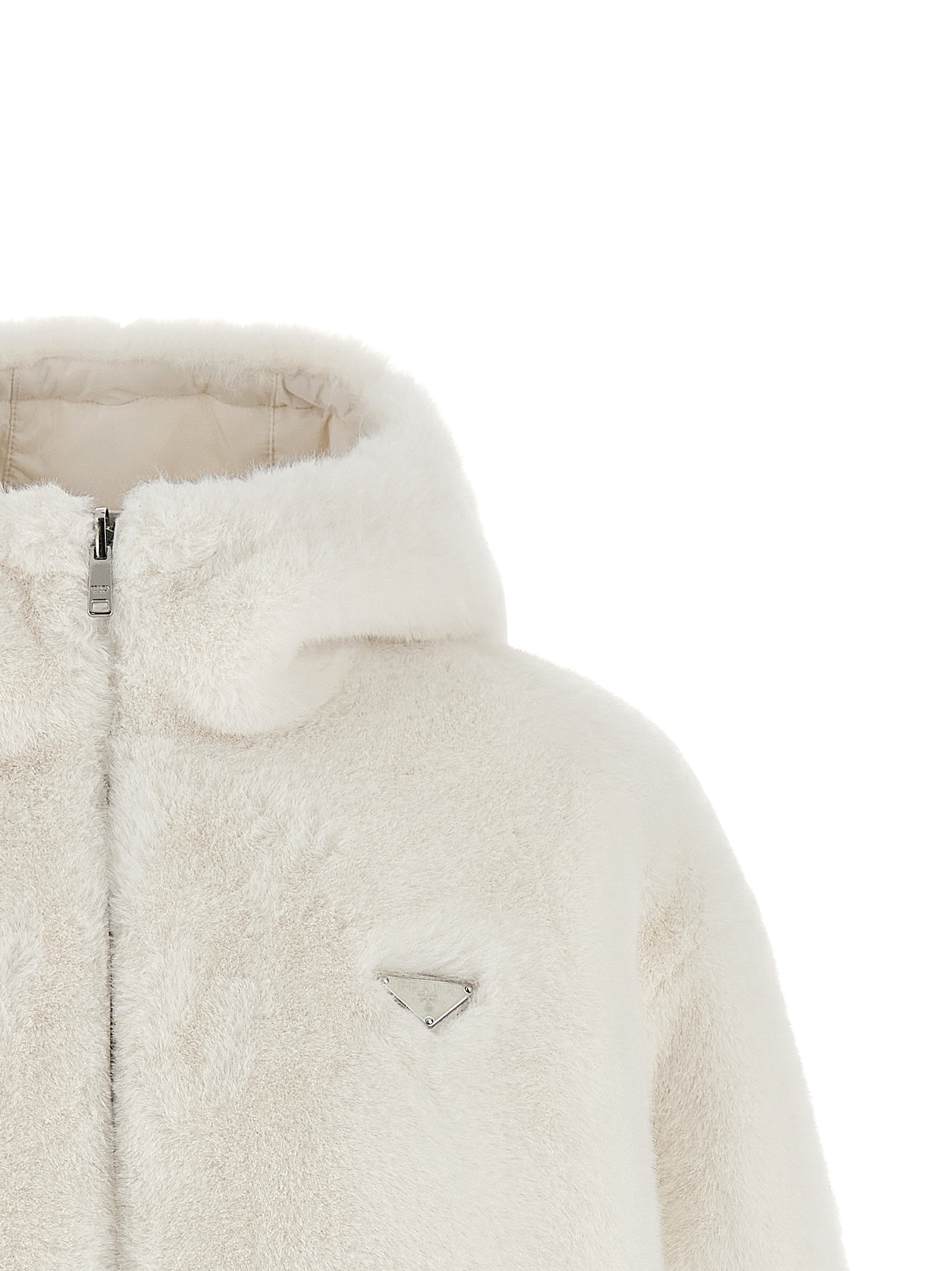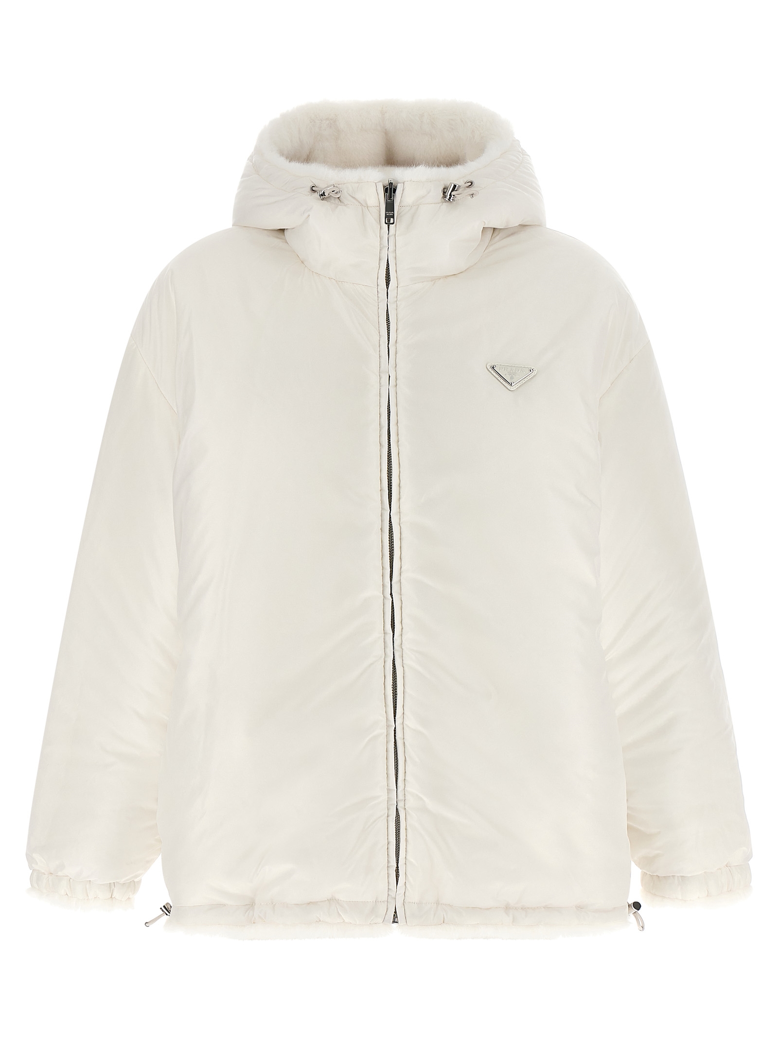 Реверсивна куртка з штучного хутра та Re-Nylon з набивкою з гусячого пір'я, регульований капюшон, трикутний логотип з емальованого металу та застібка на блискавці спереду, кишені, довгі рукави з еластичними манжетами, шнурок на подолі. СТАЛИЙ: Цей виріб виготовлений з використанням волокна з переробленого поліаміду econyl®.