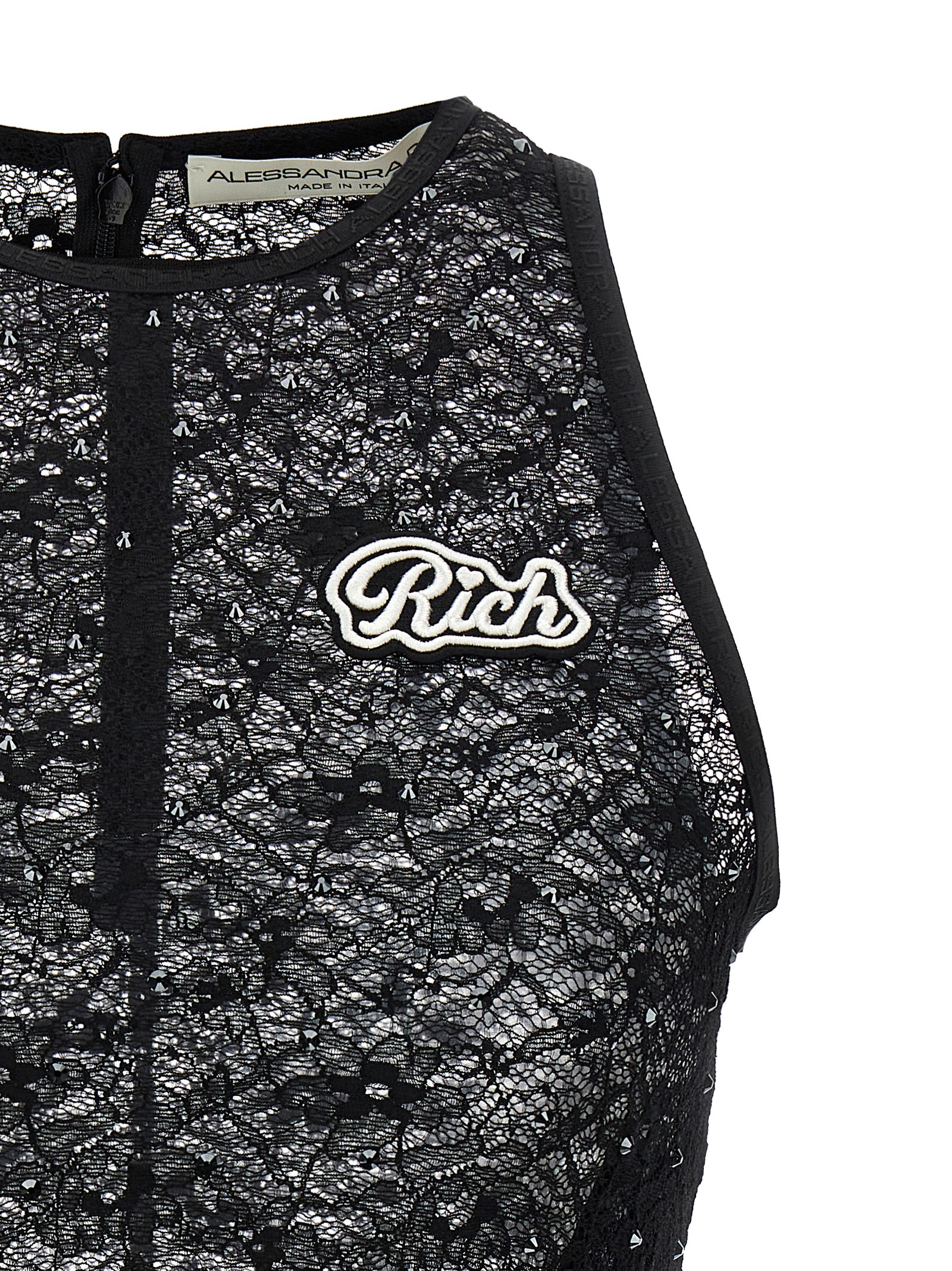 Топ з мереживом з аплікацією зі стразів, круглий виріз, без рукавів, укорочений стиль, вишивка логотипу спереду, застібка на блискавці ззаду.