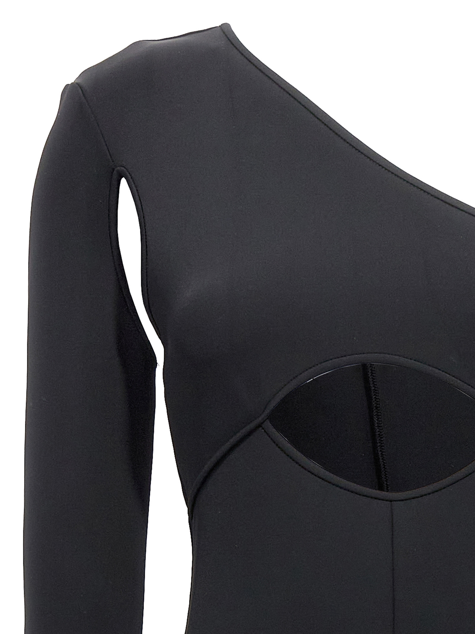 Боді з еластичної тканини з вирізами спереду, одним плечем з довгими рукавами, застібкою на блискавці ззаду, довгими штанинами з манжетами на дні.