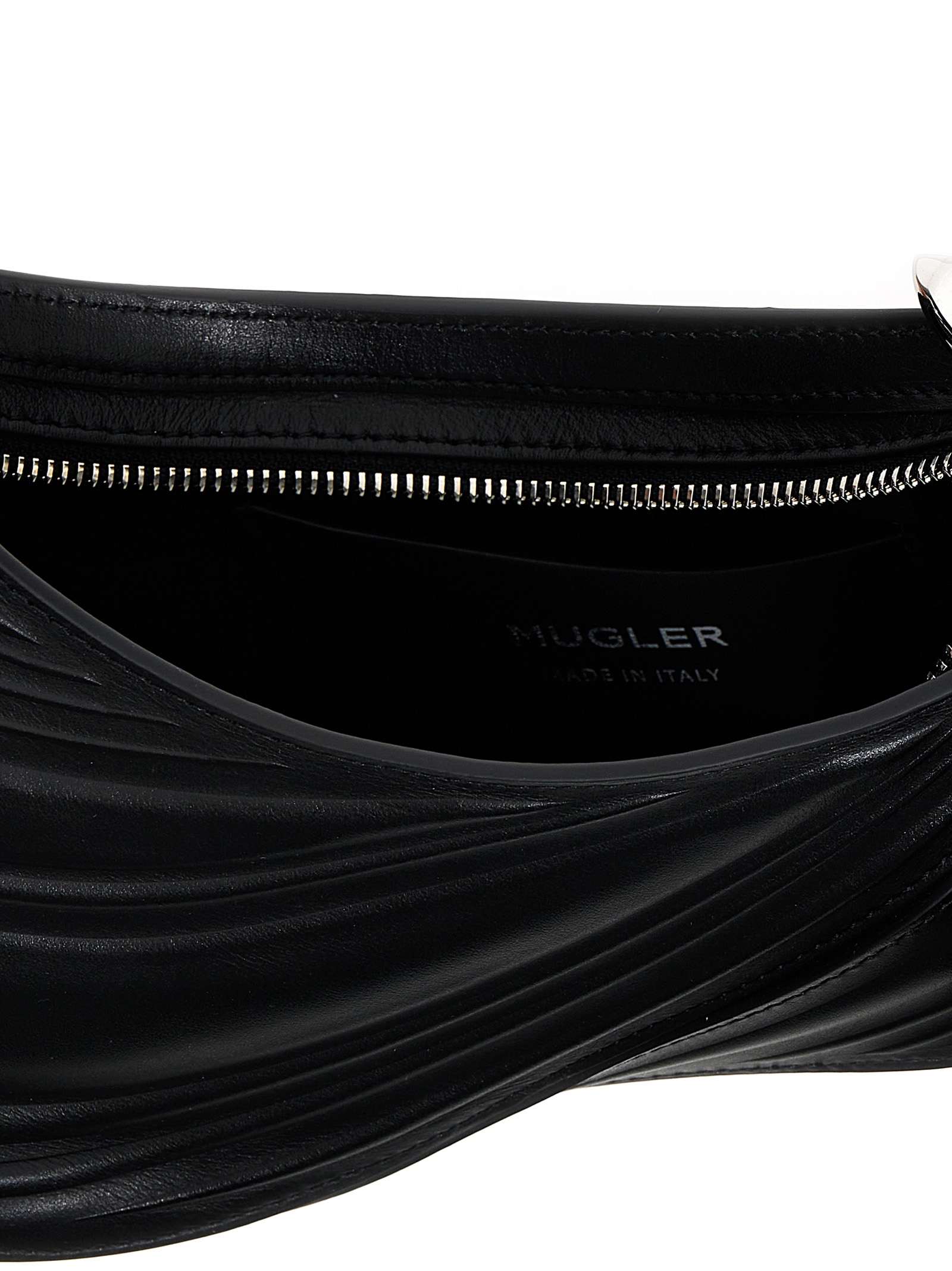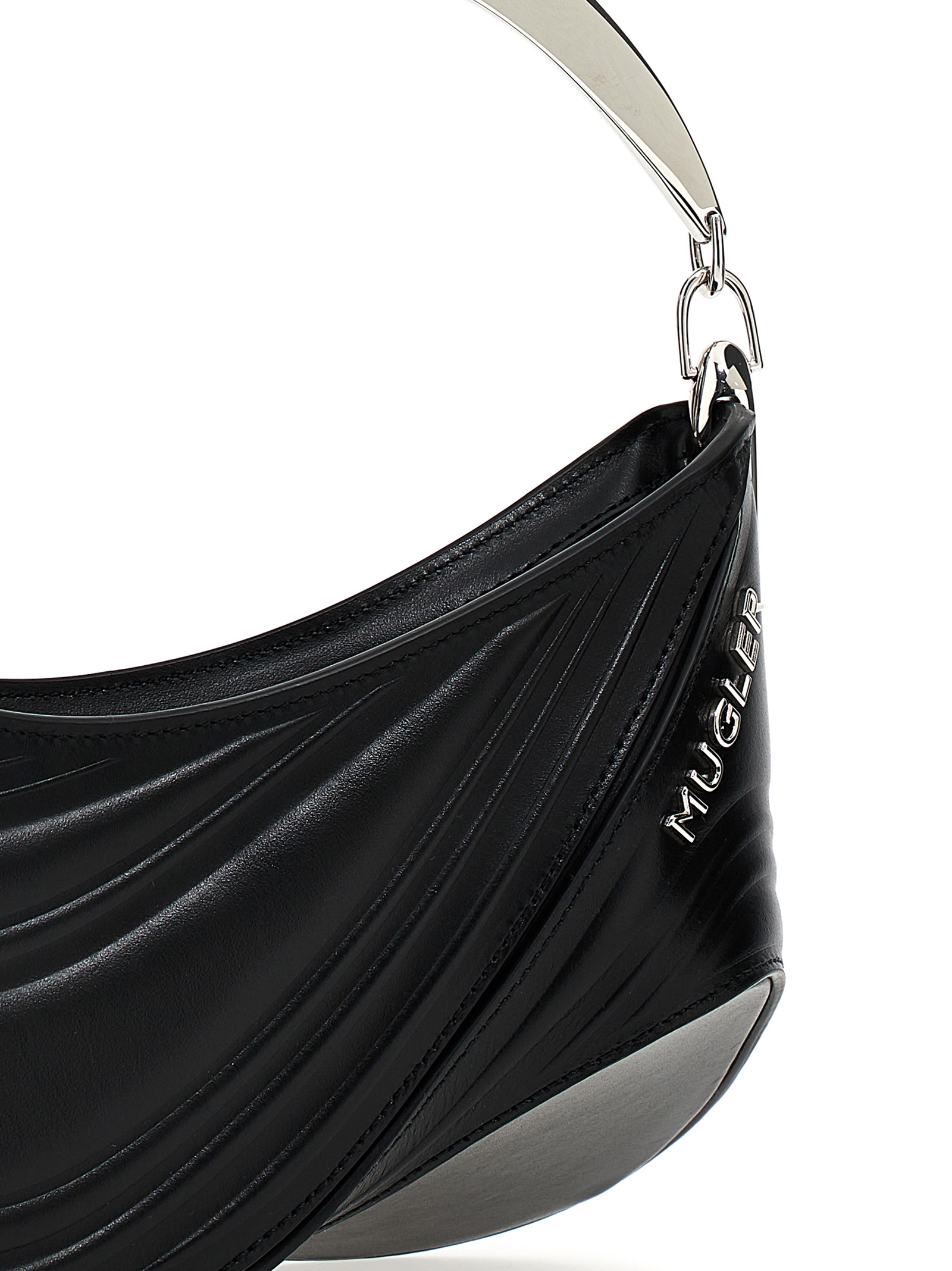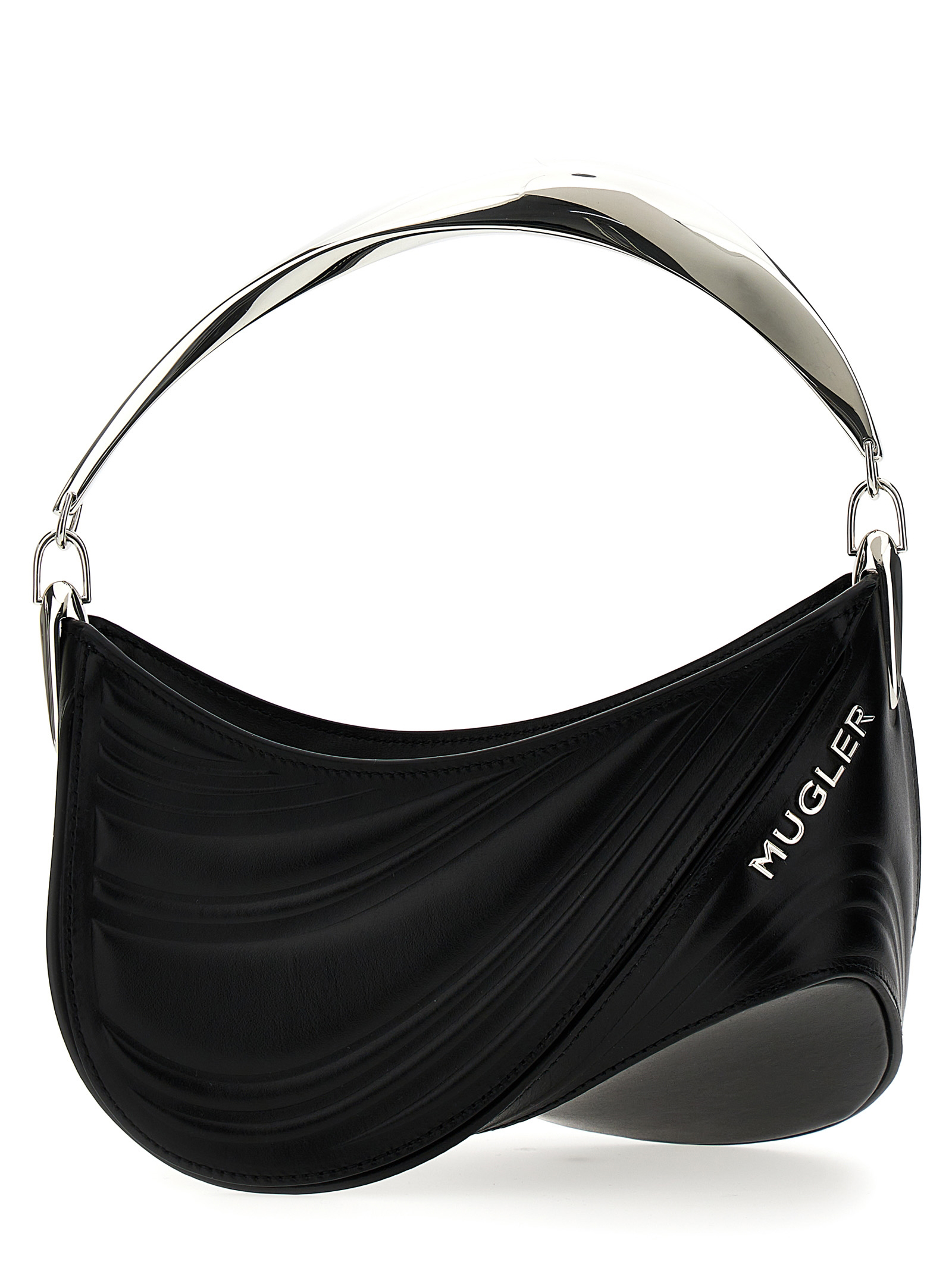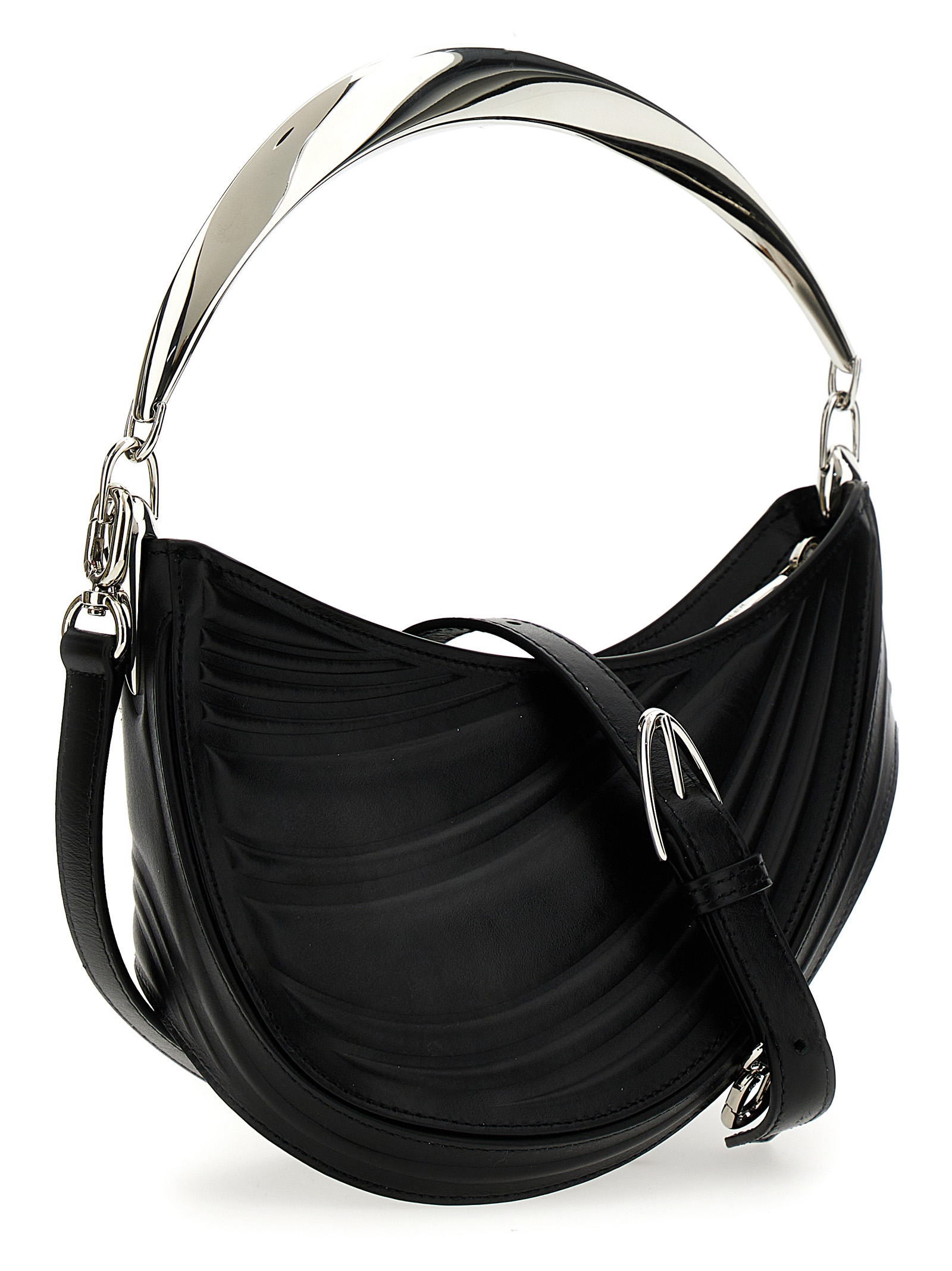 Сумка 'Small Embossed Spiral Curve 01', перша іконічна сумка, розроблена Кейсі Кадволдером, виготовлена з тисненої телячої шкіри, логотипом та срібними металевими деталями, металевою ручкою, застібкою на блискавці, підкладкою з мікрофібри та додатковим ремінцем через плече.