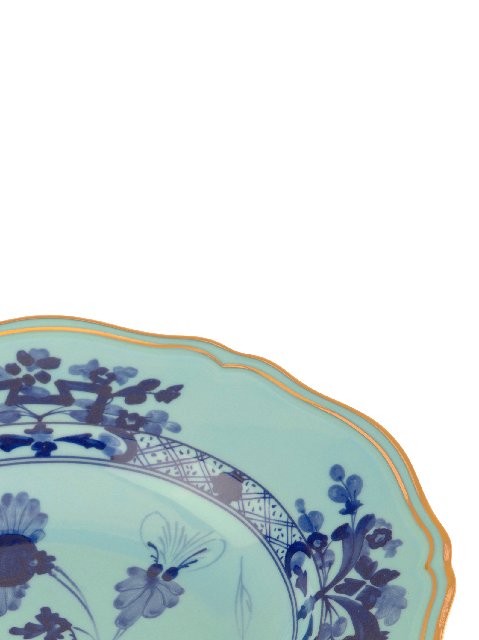 Iris porcelain soup plate with gold thread. 'Oriente Italiano' collection. Not suitable for microwave. Dishwasher safe with gentle cycle.