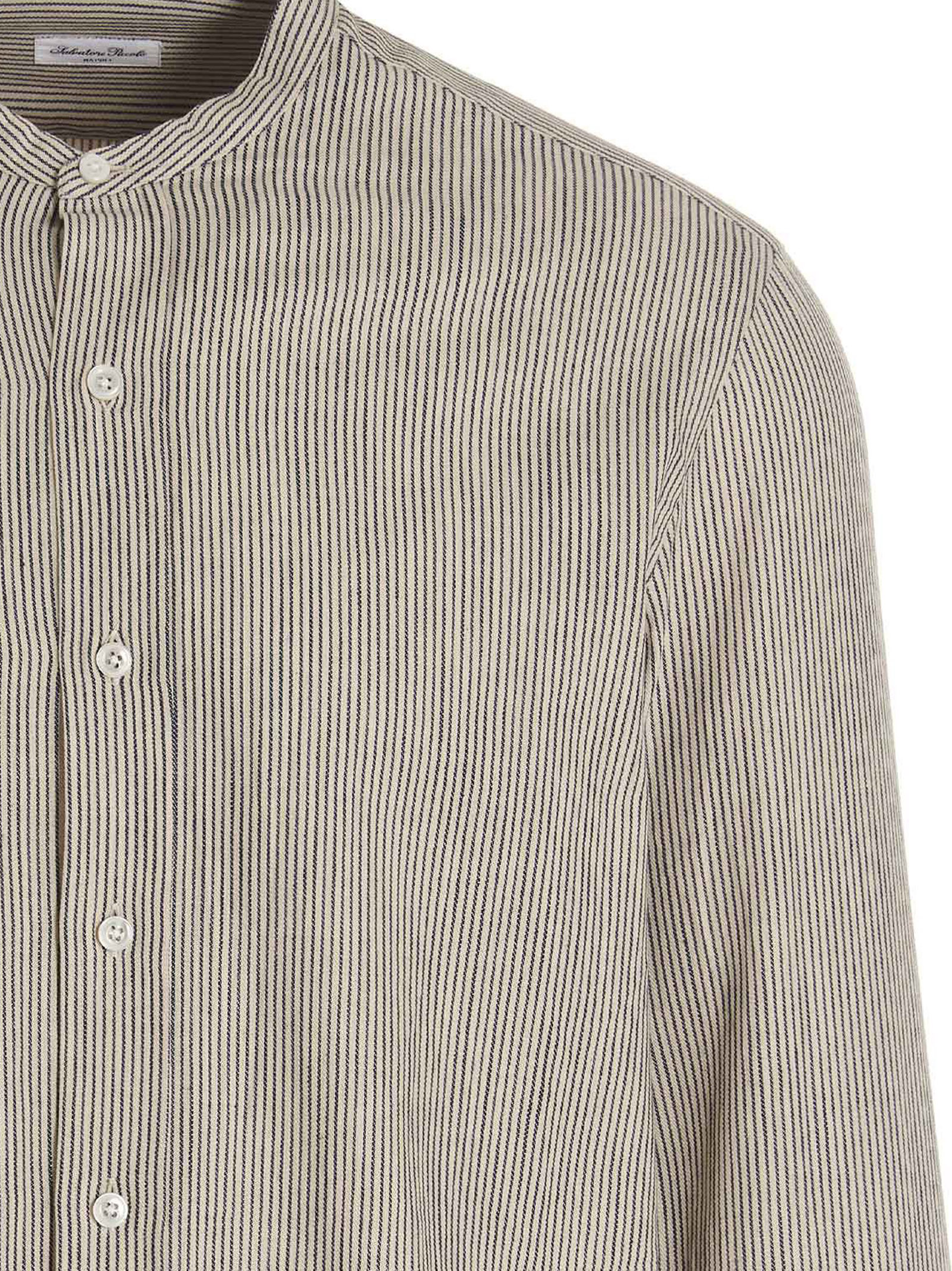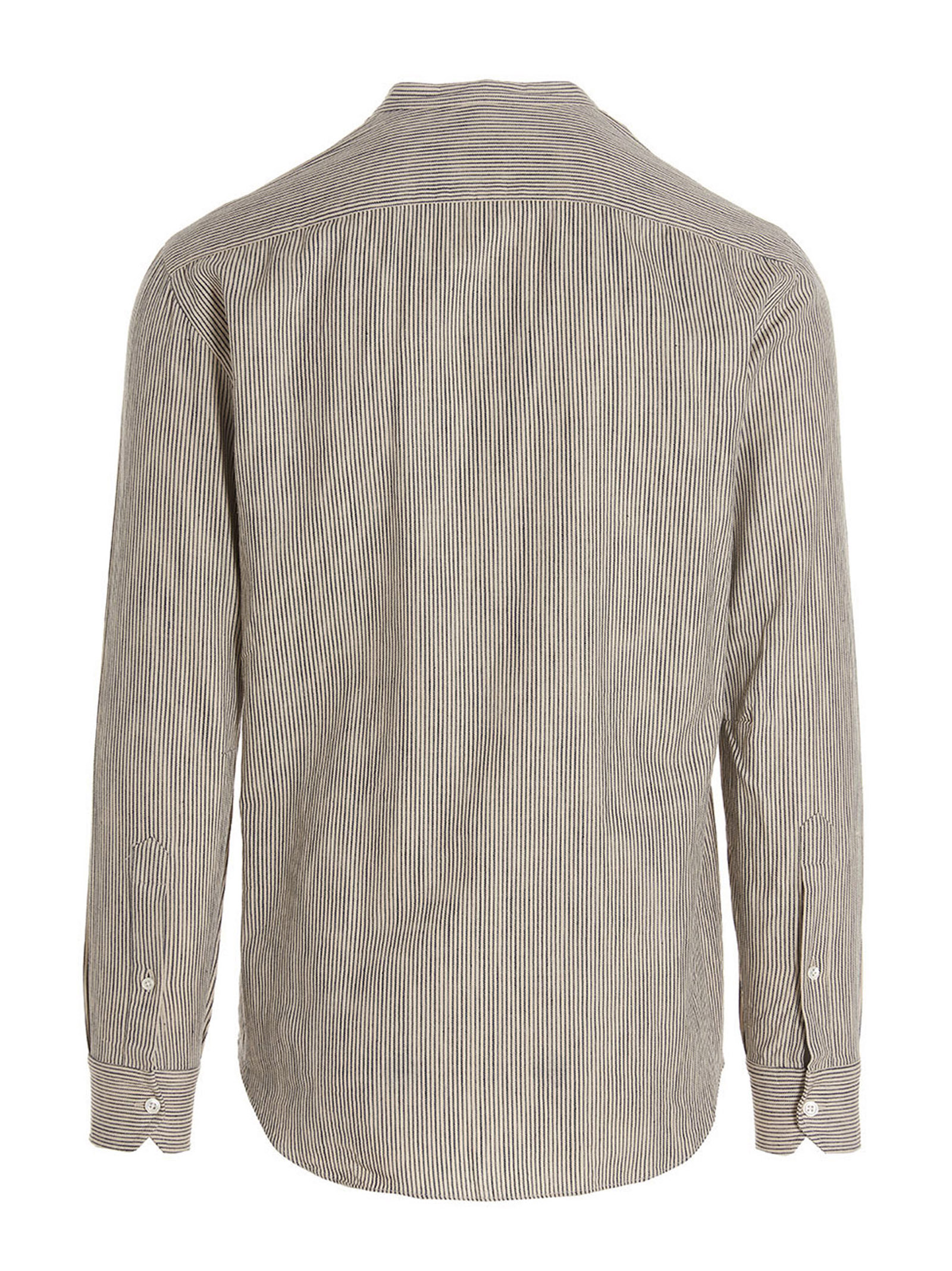 Striped cotton shirt, with mandarin collar, a button closure, and long cuffed sleeves.