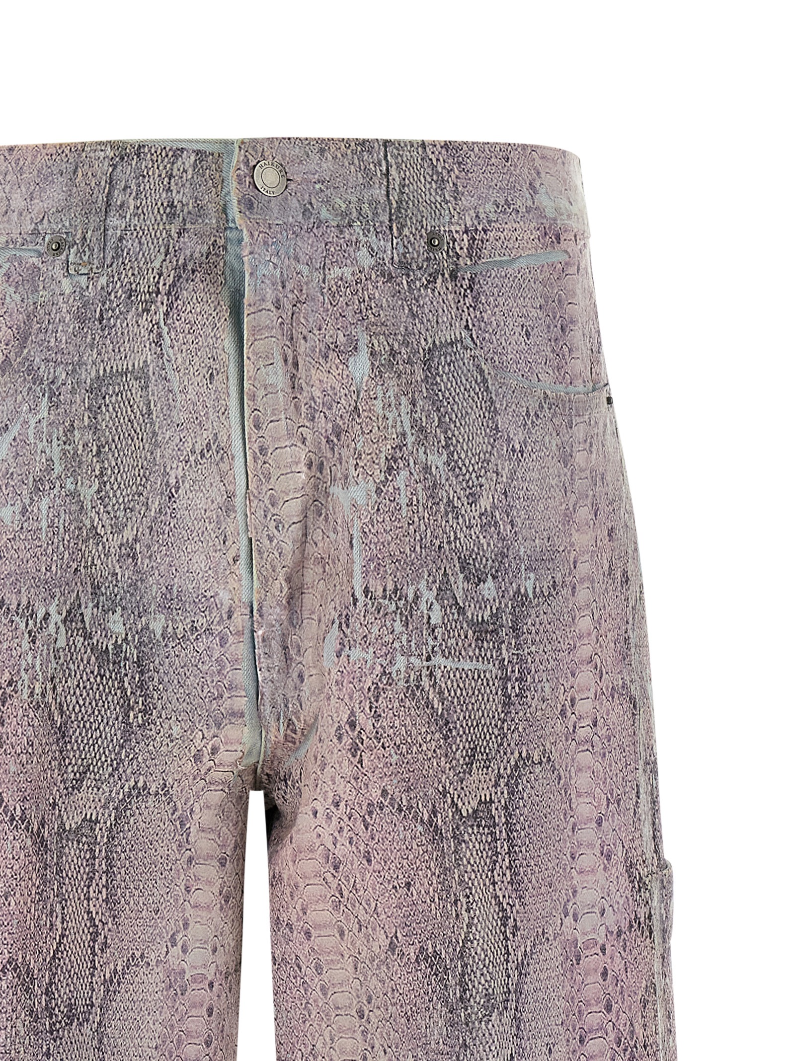 'Winona' джинси з бавовняного деніму з малюнком пітонів, модель робочого одягу, середня талія, широкий крій, передня застібка на блискавці та гудзику, п'ять кишень, етикетка з замші на спині. Оскільки друкована плівка пресується, вона прилипне до виробу по-іншому, це робить кожен екземпляр унікальним.