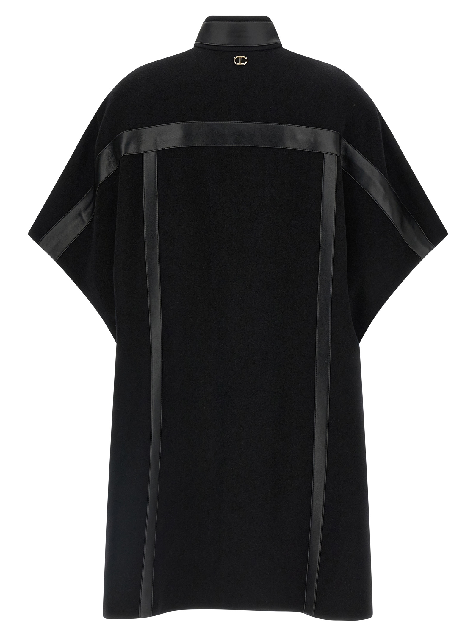 Вовняний кейп з тонкими деталями з матеріалу під шкіру, металева табличка з логотипом на спині, високий комір, передня застібка на ремінці, короткі рукави, бічні розрізи з кнопкою.