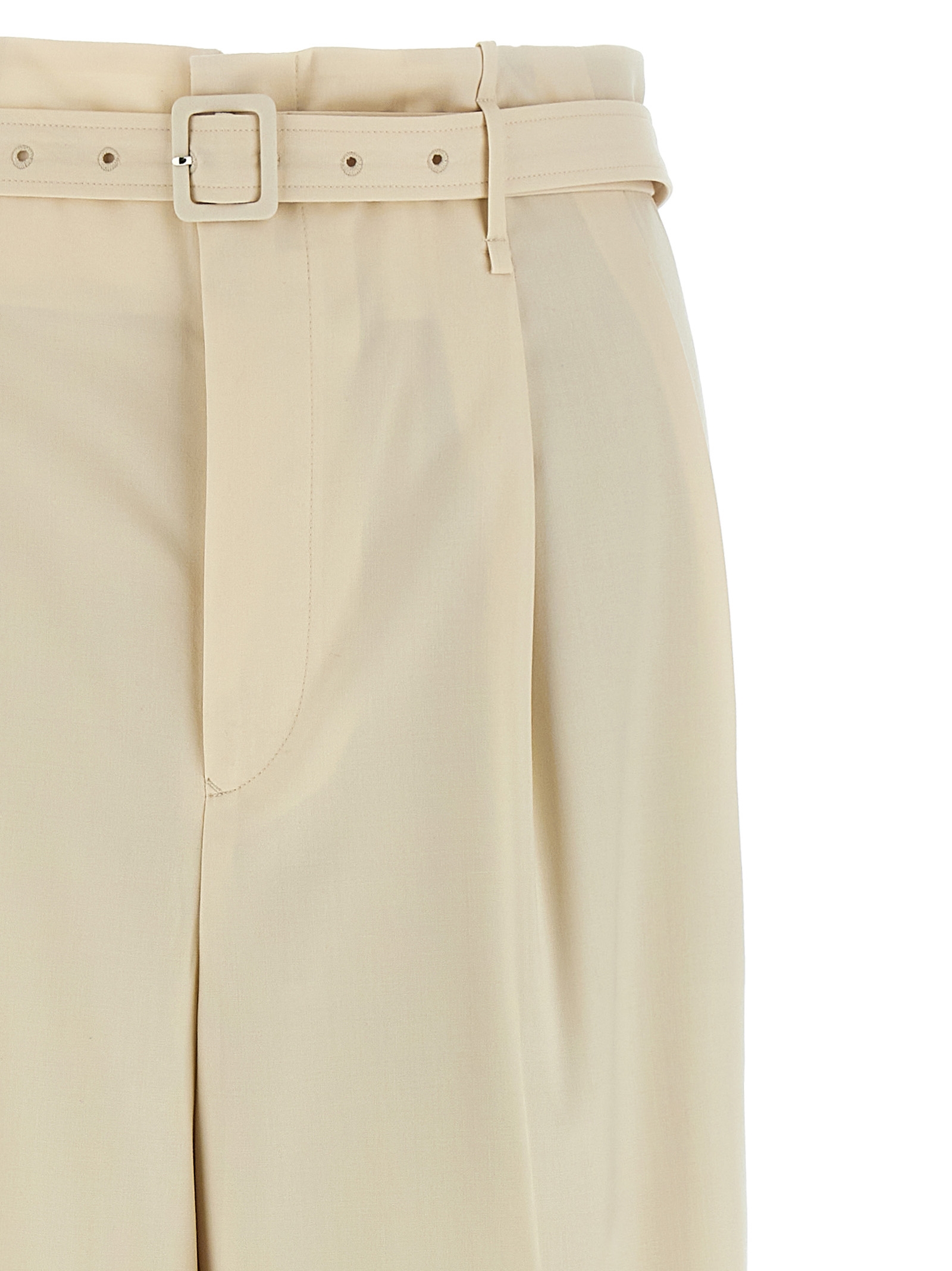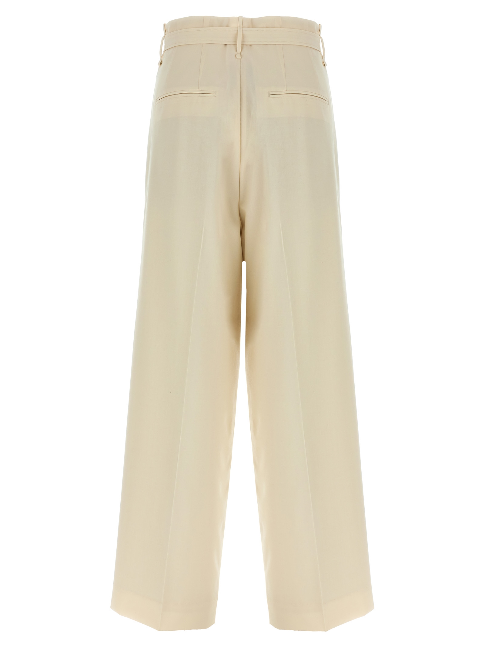 Штани з тропічної вовни високої щільності з ультратонкими пряжею Super 180, модель з високою талією та широкими штанинами, підкладка з купро, передні пінцети, розтягнуті складки, кишені, знімний пояс.